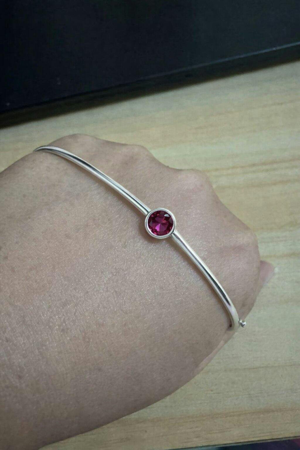 Envelop your wrist in the mesmerizing allure of this rhodium-plated .925 sterling silver bangle, designed expertly to grace a 7-inch wrist with timeless elegance. At its heart lies a 7x7mm lab-created red ruby, its vibrant hue enhanced through careful color treatment to capture and reflect light with every movement. Set in a secure bezel that promises to keep this precious gem safe, it's the centerpiece that draws eyes and invites compliments. The bangle clasps with a sturdy box mechanism, reinforced with a safety latch to ensure that this exquisite piece remains fixed on your wrist as a constant reminder of sophistication. Ideal for those who cherish the blend of modern craftsmanship and classic luxury, this bracelet transforms any ensemble into a statement of unrivaled style.