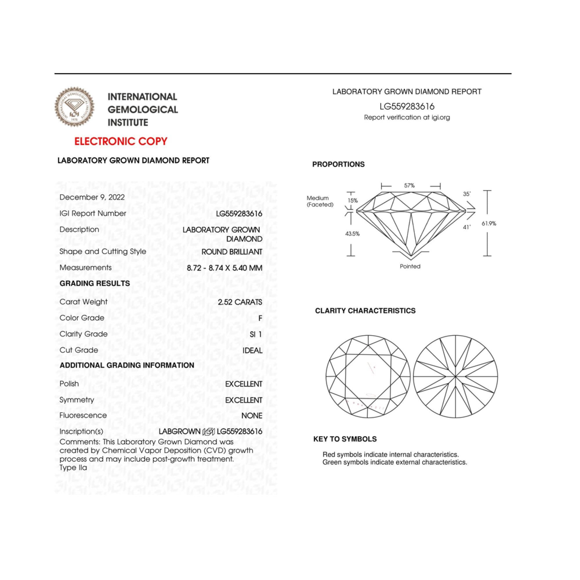 Add a touch of elegance and sophistication to your wardrobe with these classic round brilliant-cut lab-grown diamond stud earrings. Crafted from luxurious 14K white gold, these earrings showcase a total weight of 5.00 cttw of lab-grown diamonds, boasting impeccable F-G color and SI clarity. Expertly set in a 4-prong setting, each diamond is secured with screw backs, ensuring their safety and longevity. These lab-grown round diamond studs will effortlessly elevate any outfit, from casual to formal, making them a versatile and essential addition to your jewelry collection. These earrings are perfect for gift-giving or for treating yourself to a timeless treasure. Don't miss out on the opportunity to own these stunning pieces of jewelry. Diamond Studs are certified by the International Gemological Institute for added value and assurance.