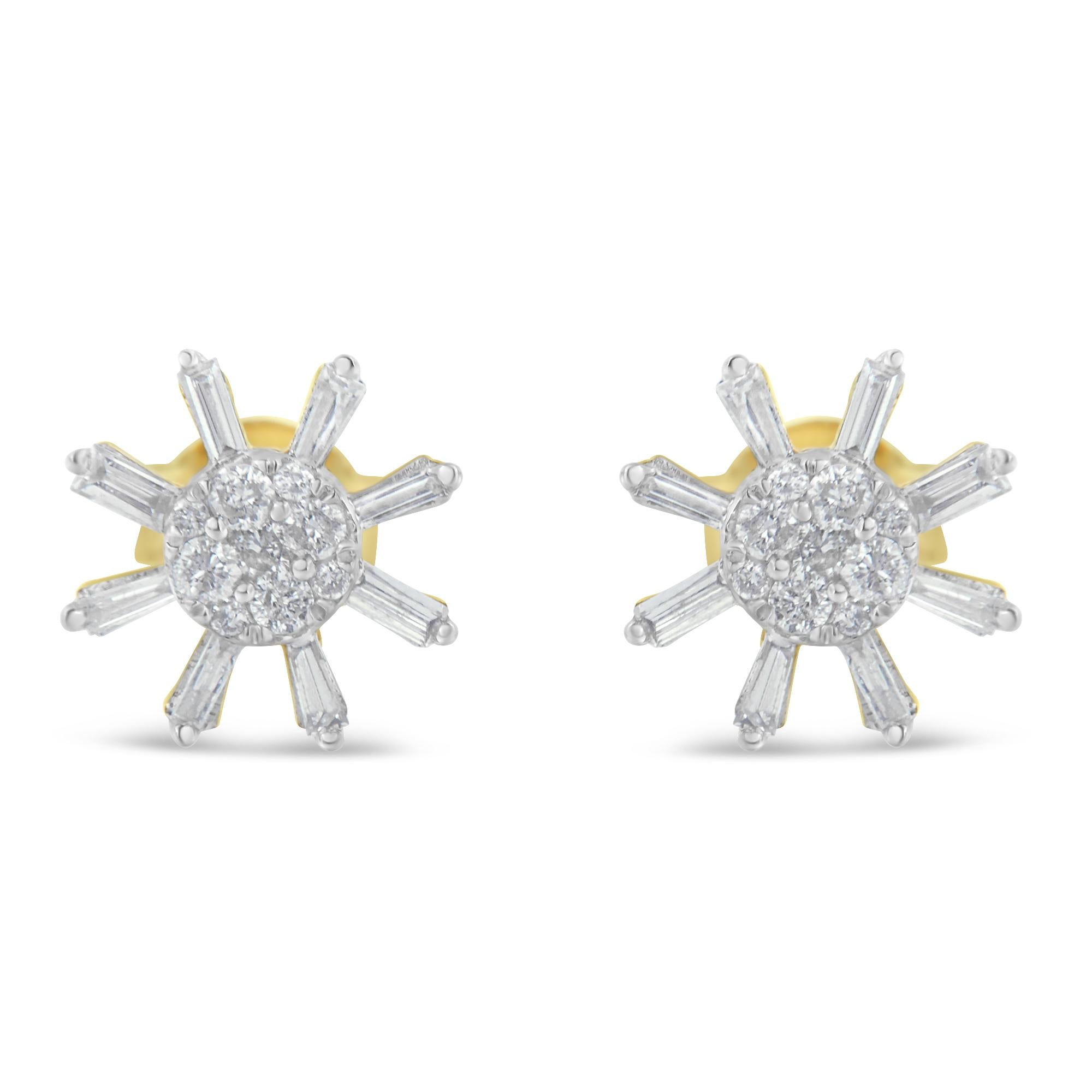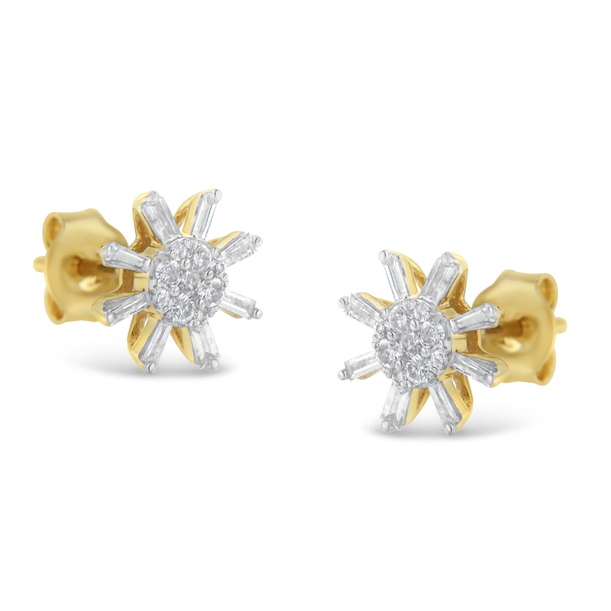 Discover the exquisite radiance of these 10k yellow gold diamond stud earrings, a symphony of light designed to captivate. Each earring sparkles with a central round cluster of natural diamonds, flanked by meticulously placed baguette-cut stones that radiate outward like rays of sunlight. Together, these diamonds weigh 0.50 carats and are graded H-I in color and I2-I3 in clarity, striking a balance between luminosity and affordability. These earrings feature a secure post back, ensuring they remain your faithful companions for all occasions. Whether itâs a casual brunch or an elegant evening affair, this pair will draw eyes to your refined taste in accessories. Embrace the allure of a design that marries classic charm with modern elegance, perfectly encapsulated in the model, your next beloved heirloom.
