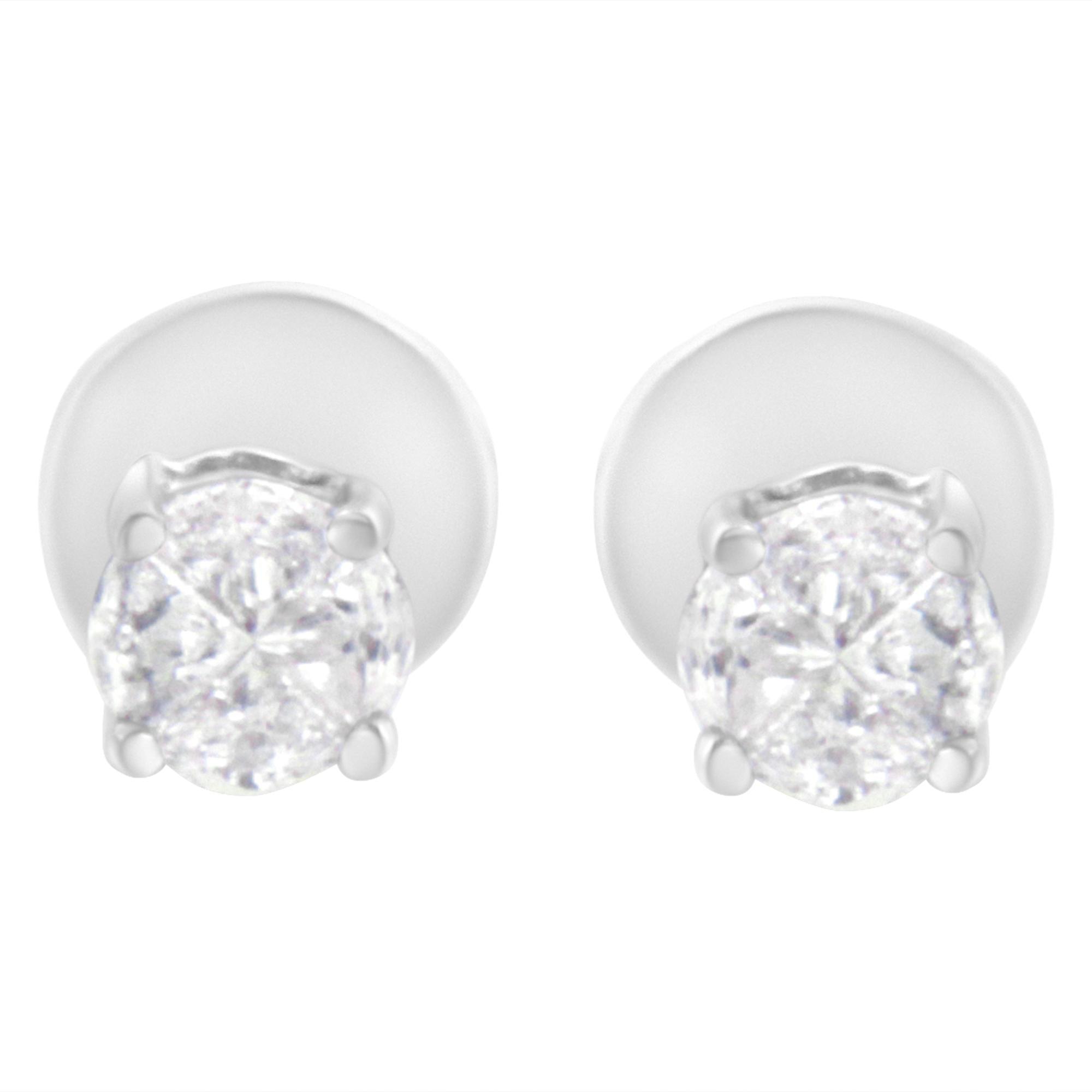 Adorn yourself with these lovely and sparkling solitaire earrings. Each stud is embellished with 4 natural, pie-cut diamonds in a classic prong setting. The diamonds have a total carat weight of 1/2 cttw and are set in gleaming 14k white gold. These come with a push back mechanism for a safe and secure fit on your ears. These gold and diamond earrings are the perfect accessory for everyday wear.