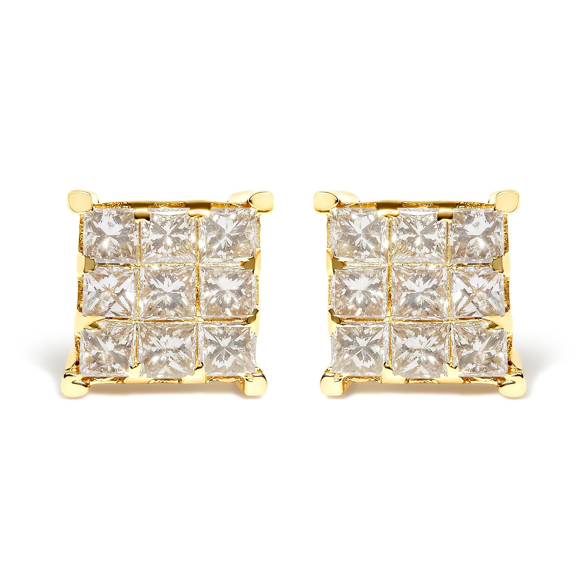 14K Yellow Gold 1 1/2 Cttw Invisible Set Princess-Cut Diamond 9 Stone Square Stud Earrings (J-K Color, SI2-I1 Clarity)