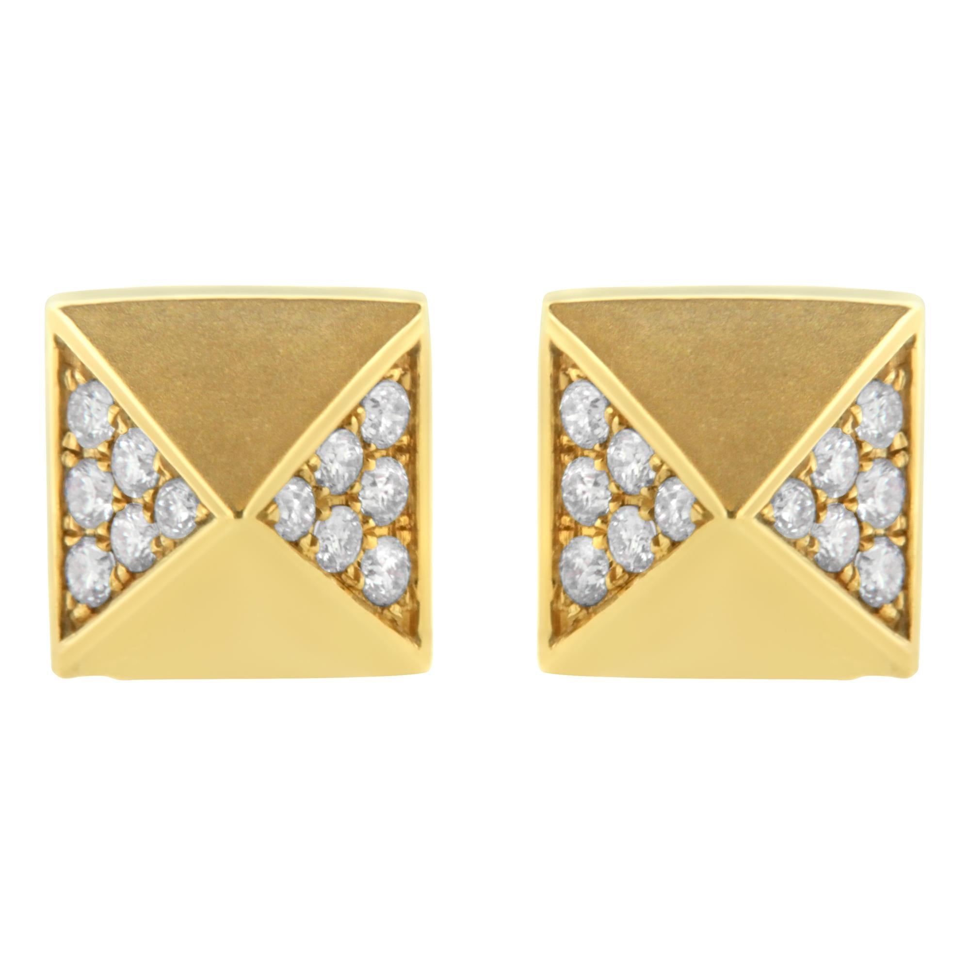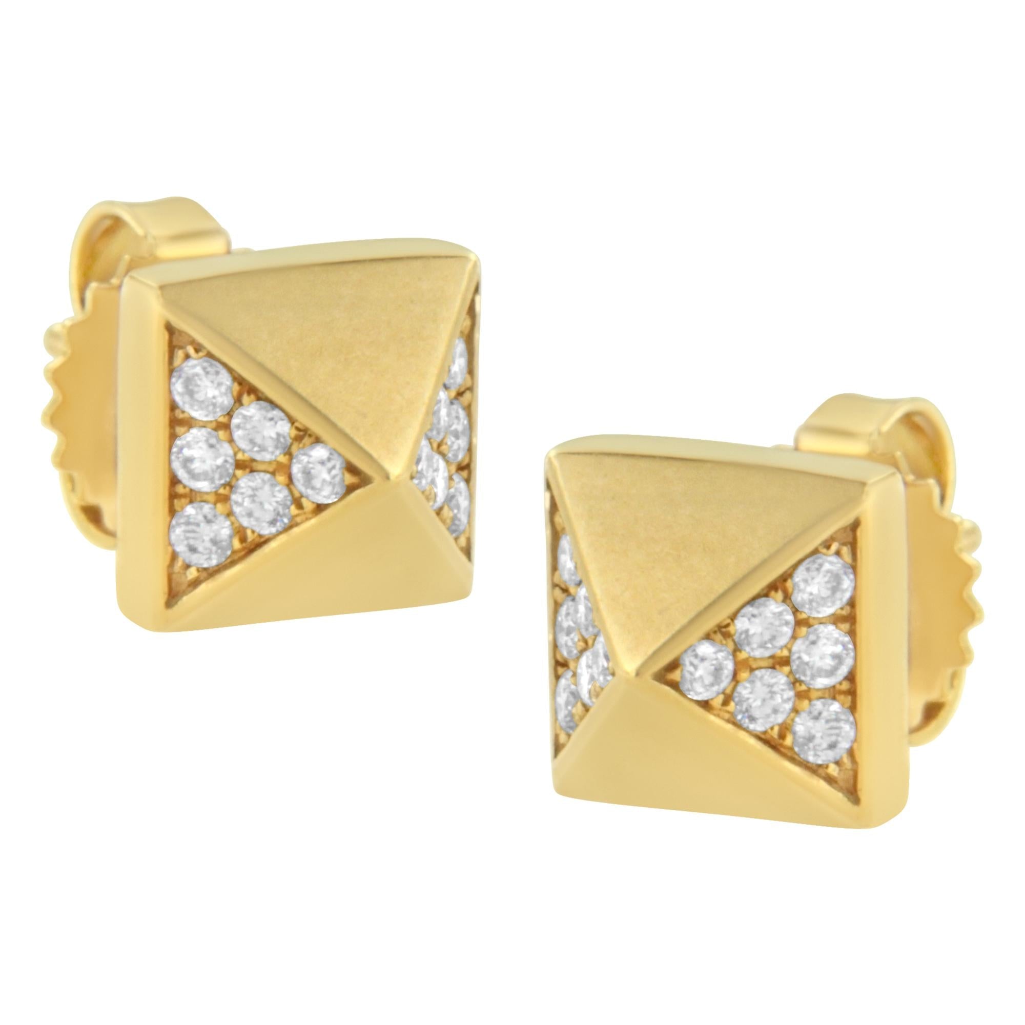 Discover the epitome of elegance with these radiant diamond pyramid stud earrings, meticulously crafted from lustrous 14K yellow gold. Each stud dazzles with a quarter carat of natural diamonds, boasting G-H color and SI1-SI2 clarity, arranged in a captivating pyramid shape that catches the light with every turn. The precision of their cut reflects not just light but the artistry behind their creation. Secured with a post and pushback closure, these earrings promise both comfort and style. Ideal for enriching everyday wear or elevating special occasions, they offer a timeless allure that makes them a perfect gift or a treasured addition to any jewelry collection.
