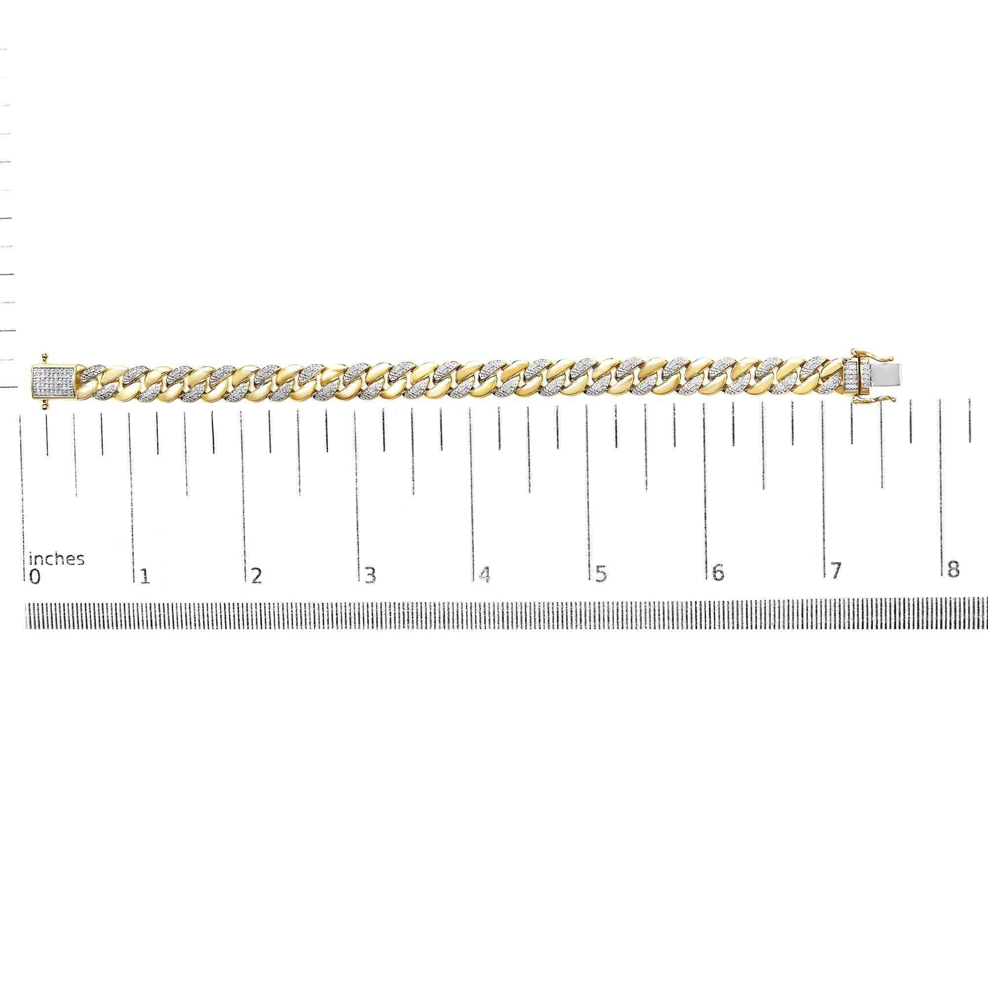 Immerse yourself in the timeless elegance of this exquisite bracelet, where classic design meets contemporary charm. Crafted from .925 sterling silver and lavishly coated in 14K yellow gold, this piece embodies luxury. Its iconic Cuban link silhouette is meticulously enhanced with natural diamonds totaling 3/8 carat. Each gem reflects with a serene I-J color and I3 clarity, capturing the light with every movement and casting a spell of sophisticated sparkle. Measuring 7.25 inches and secured with a sturdy box clasp complete with a safety latch, this bracelet not only promises a comfortable fit but assures peace of mind in its durability. Perfect for those who appreciate a blend of traditional craftsmanship and modern allure, this bracelet is an indispensable accessory for any refined jewelry collection.