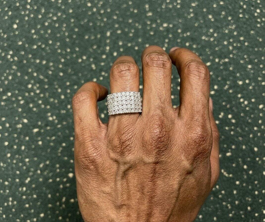 Indulge in the opulence of this exquisite creation, a testament to timeless elegance and impeccable craftsmanship. Five rows of natural diamonds, each hand-selected for their captivating I-J color and I1-I2 clarity, unfurl across the rhodium-plated 14k white gold band, creating a mesmerizing cascade of sparkle and fire. Totaling an awe-inspiring 4.0 carats, these diamonds dance with brilliance, catching every ray of light to enchant and dazzle. The band, with its refined 4 mm width, exudes sophistication and grace, the rhodium plating bestowing a lustrous finish that promises enduring radiance. This ring is not merely an accessory but a celebration of luxury and a promise of eternity. With unparalleled beauty and a design that transcends trends, this masterpiece invites you to adorn your hand with its everlasting allure, becoming a significant piece in your collection and a cherished symbol of elegance.