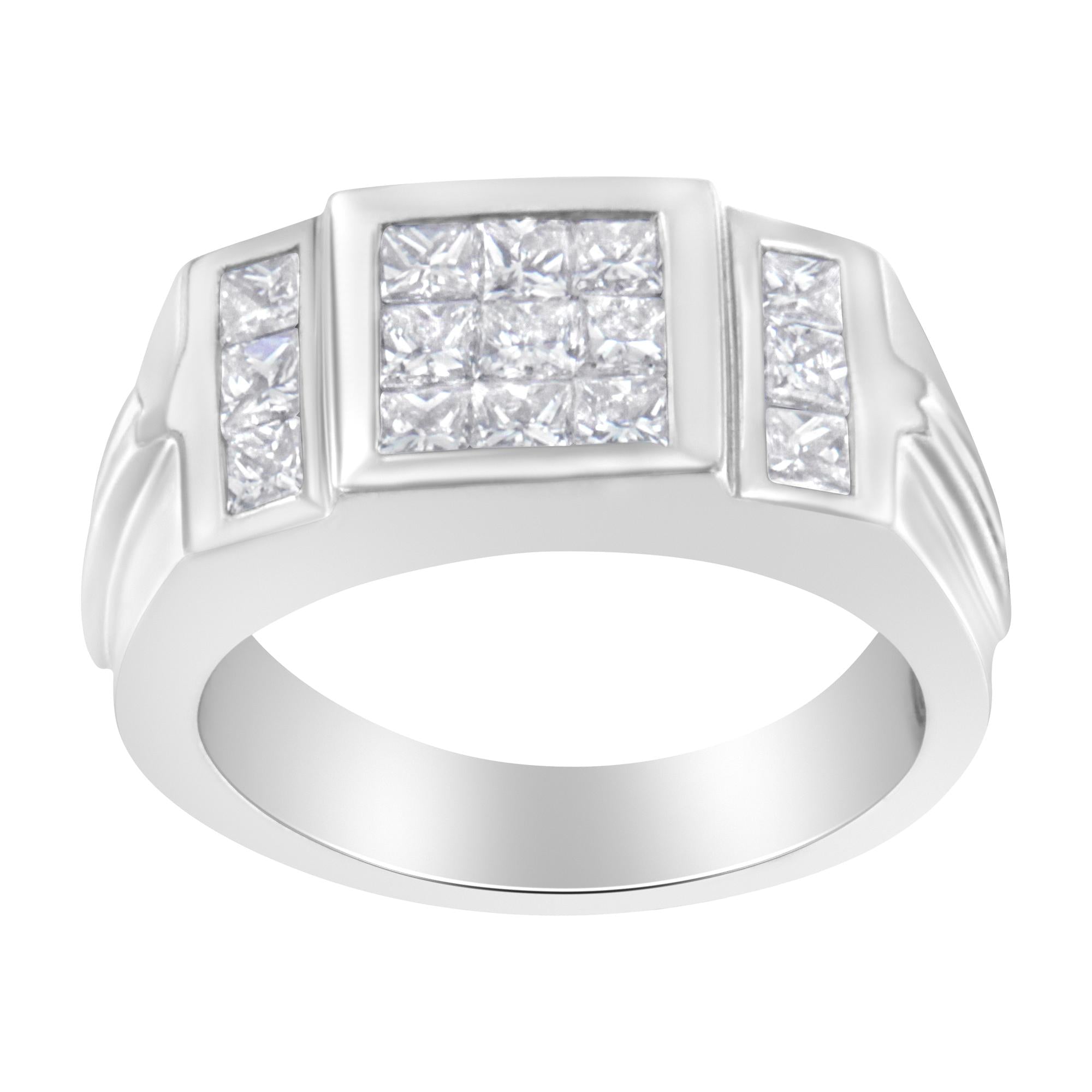 Your love for him will radiate in this unique and stylish diamond ring. Classy and appealing, the ring is created with 14 karats white gold and buffed high to shine brilliantly. It captures the gleaming princess cut diamonds that makes this ring to sparkle like a star and make you enjoy the compliments it will garner.