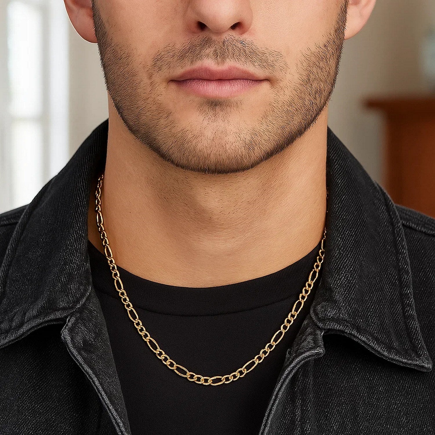 This solid Figaro chain comes in 14k yellow gold and has a width of 4.5 millimeters.