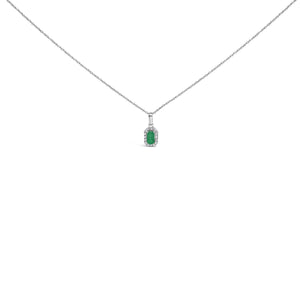14K White Gold Oval Green Emerald and Diamond Halo Pendant Necklace - 18" Inches