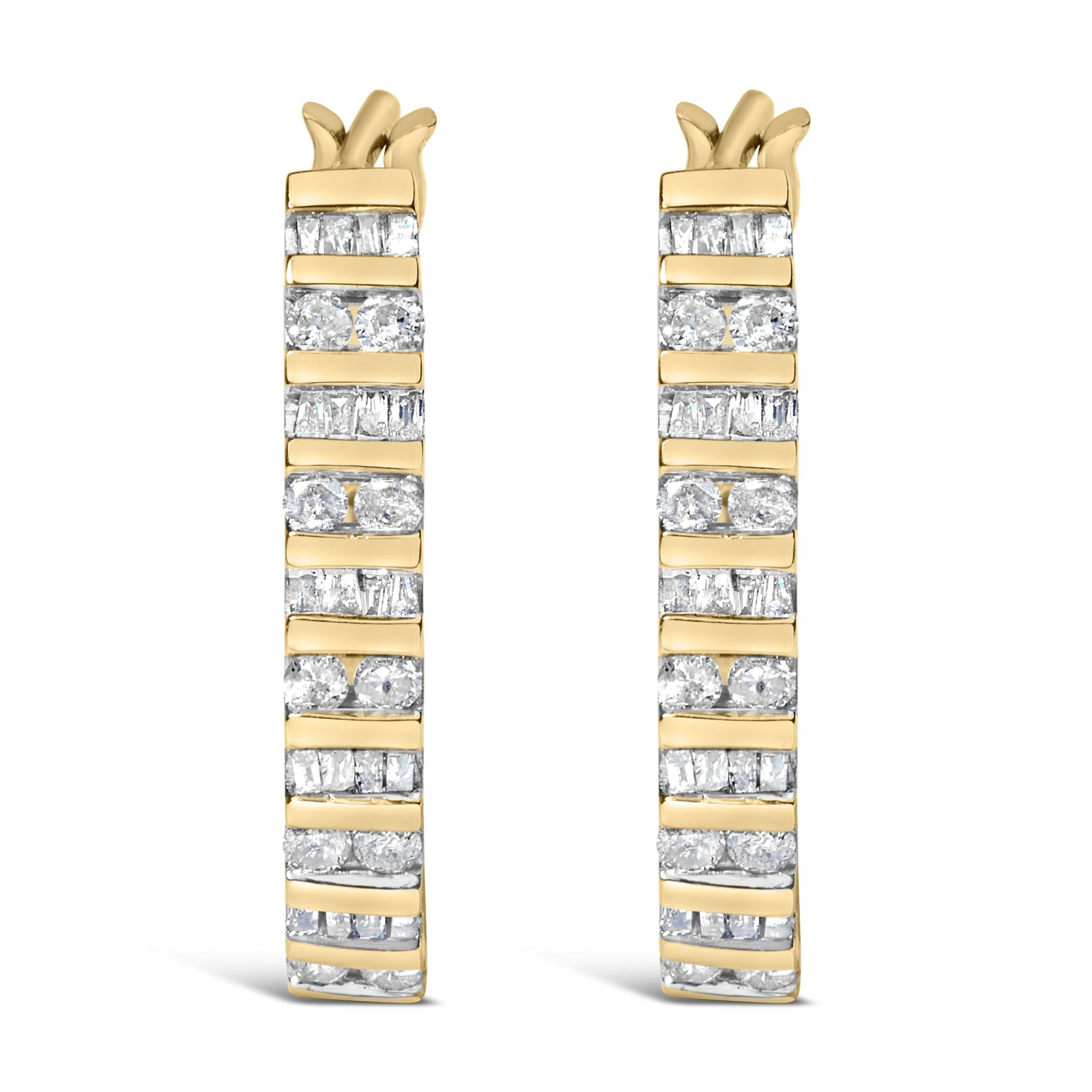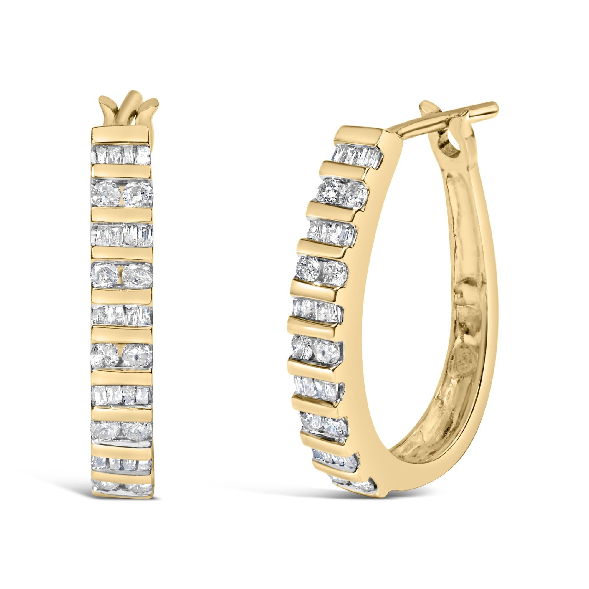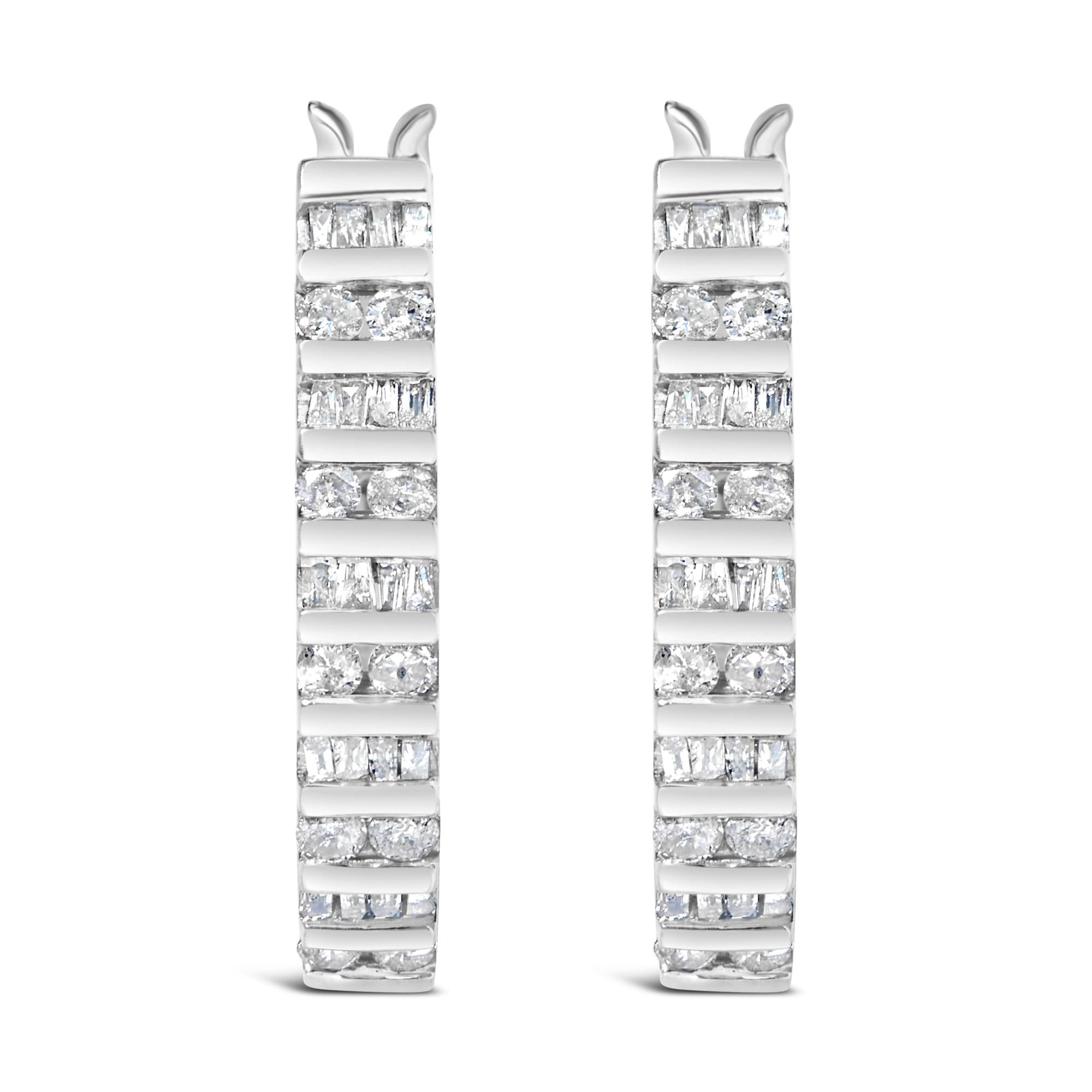 Immerse yourself in the sublime elegance of these exquisite hoop earrings, masterfully crafted from 10K white gold and adorned with a total of 1.0 carat of natural diamonds. Each earpiece shimmers with a captivating dance of light, thanks to a meticulous alternating arrangement of round and baguette-cut diamonds that alternate along its graceful 'U' shape. Treated with a layer of rhodium plating, these hoops boast enhanced brilliance and resilience, inviting admiration and envy in equal measure. The color grade of I-J and clarity of I2-I3 ensure a luminous glow that complements any ensemble, while the hinge back closure promises a secure and plush fit, making them perfect for both grand evenings and everyday elegance. Bathed in luxury, these earrings are not just accessories but a celebration of craftsmanship and style, designed to be treasured for generations.