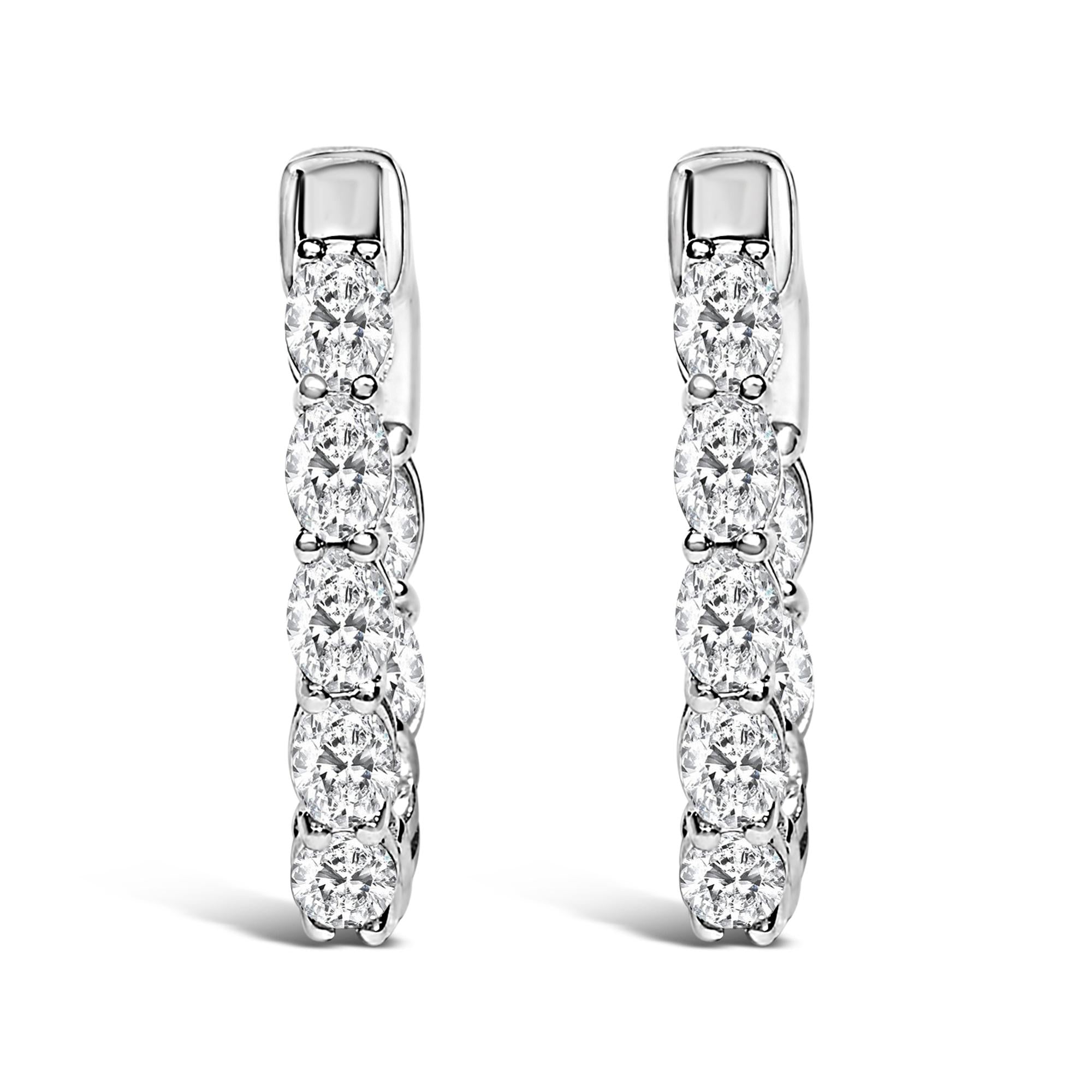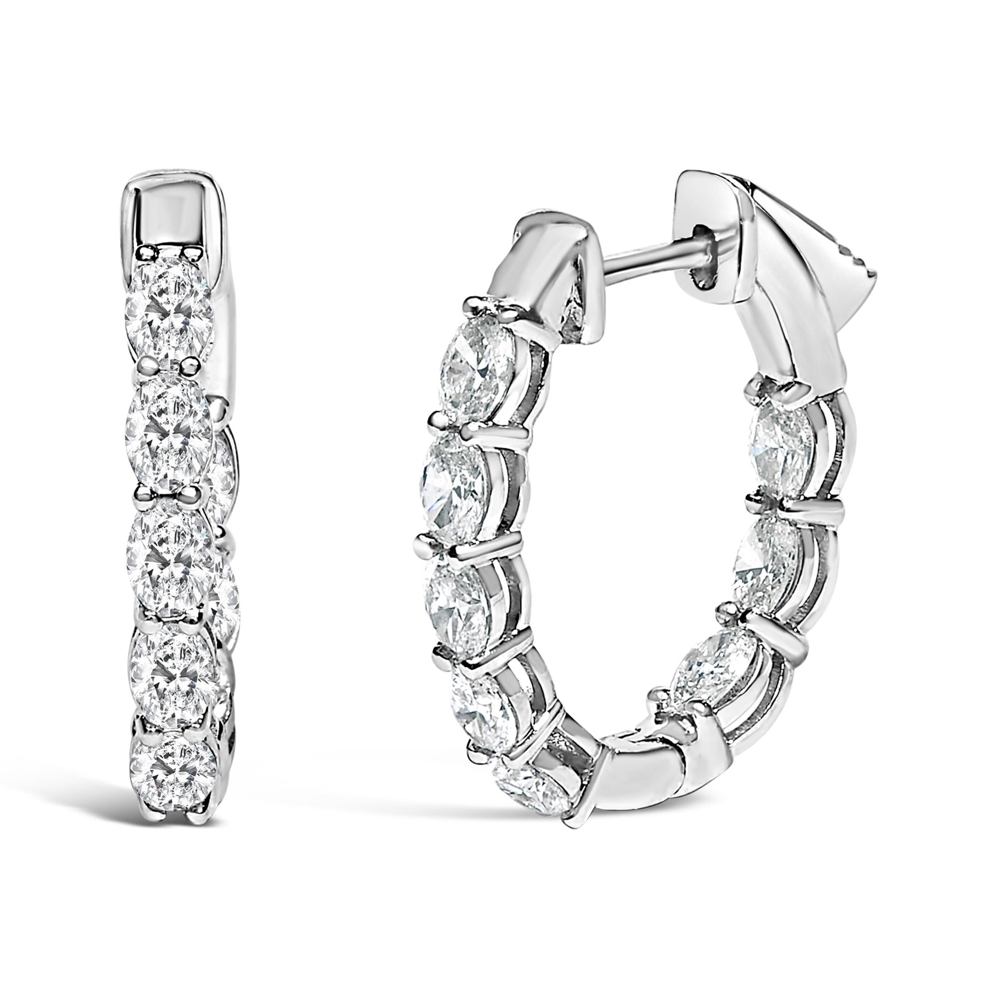 Discover elegance redefined with these exquisite 14K white gold hoop earrings, adorned with 2 3/4 carats of lab-grown diamonds that dazzle brilliantly in every light. Each diamond, meticulously oval-cut and set with shared prongs, mirrors the ethos of perfection and sustainability. The rhodium plating enhances their luminosity, ensuring a radiance that endures. Measuring 4/5 inches in dangle and 3 mm in width, these hoops are designed to be a subtle yet striking addition to any attire. Embrace the future of fine jewelry with these enchanting earrings, where luxury meets conscientious craftsmanship. Secure them with ease, thanks to their reliable hinge backs, and let them uplift your spirit and style.