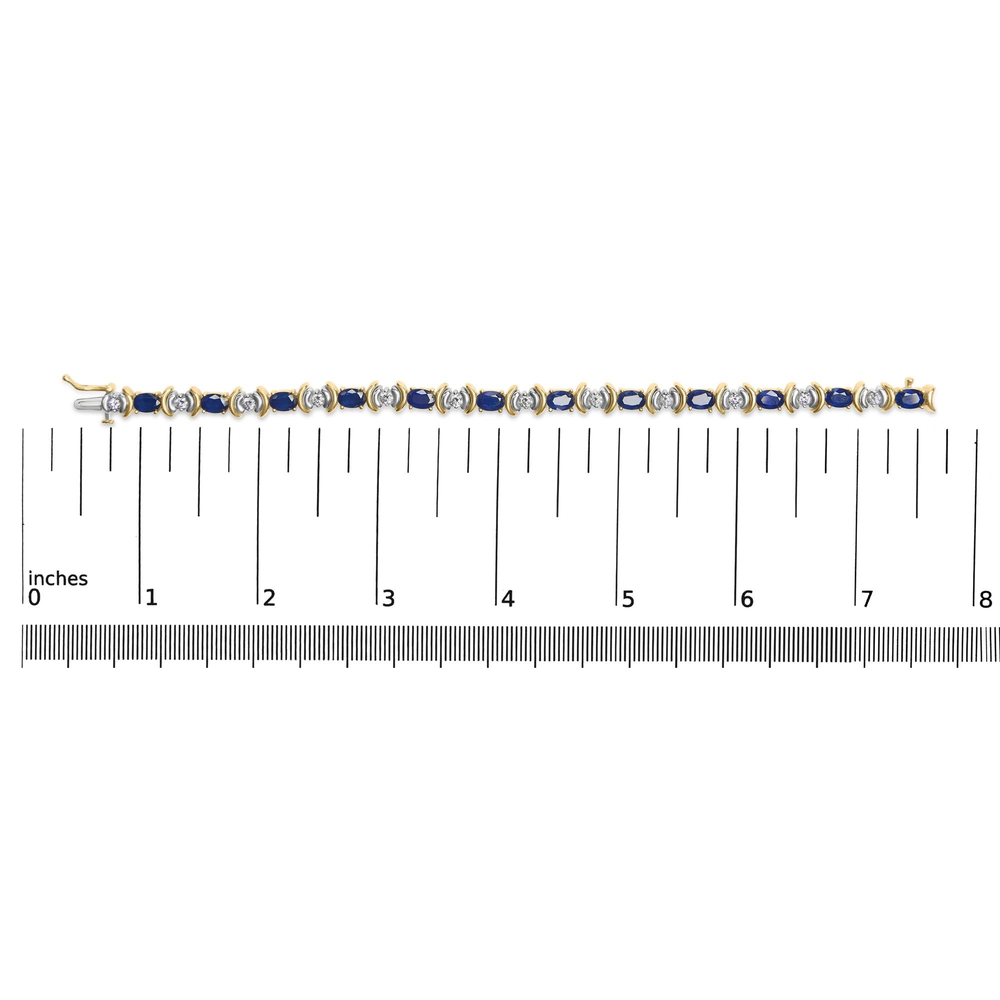 Unveil the epitome of elegance with this resplendent 14K yellow gold bracelet, a harmonious dance of alternating oval blue sapphires and scintillating round diamonds. Each meticulously chosen natural diamond, boasting H-I color and SI1-SI2 clarity, is cradled within links reminiscent of prong settings, ensuring both security and an aesthetic seamlessness. The sapphires, heat-treated to amplify their ethereal depth, collectively showcase a total weight of 6 1/2 carats, interspersed with 1.00 carat of diamonds that exude an everlasting brilliance. Crafted to nestle perfectly around wrists up to 7 inches, this piece is not just jewelry but a personal emblem of grace and sophistication. Secured with a box clasp and an additional latch, it promises both allure and peace of mind.