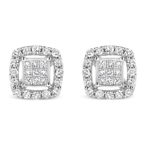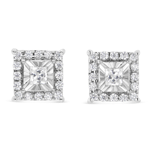 .925 Sterling Silver 1/4 Cttw Princess and Round Cut Diamond Halo Stud Earrings (I-J Color, I2-I3 Clarity)