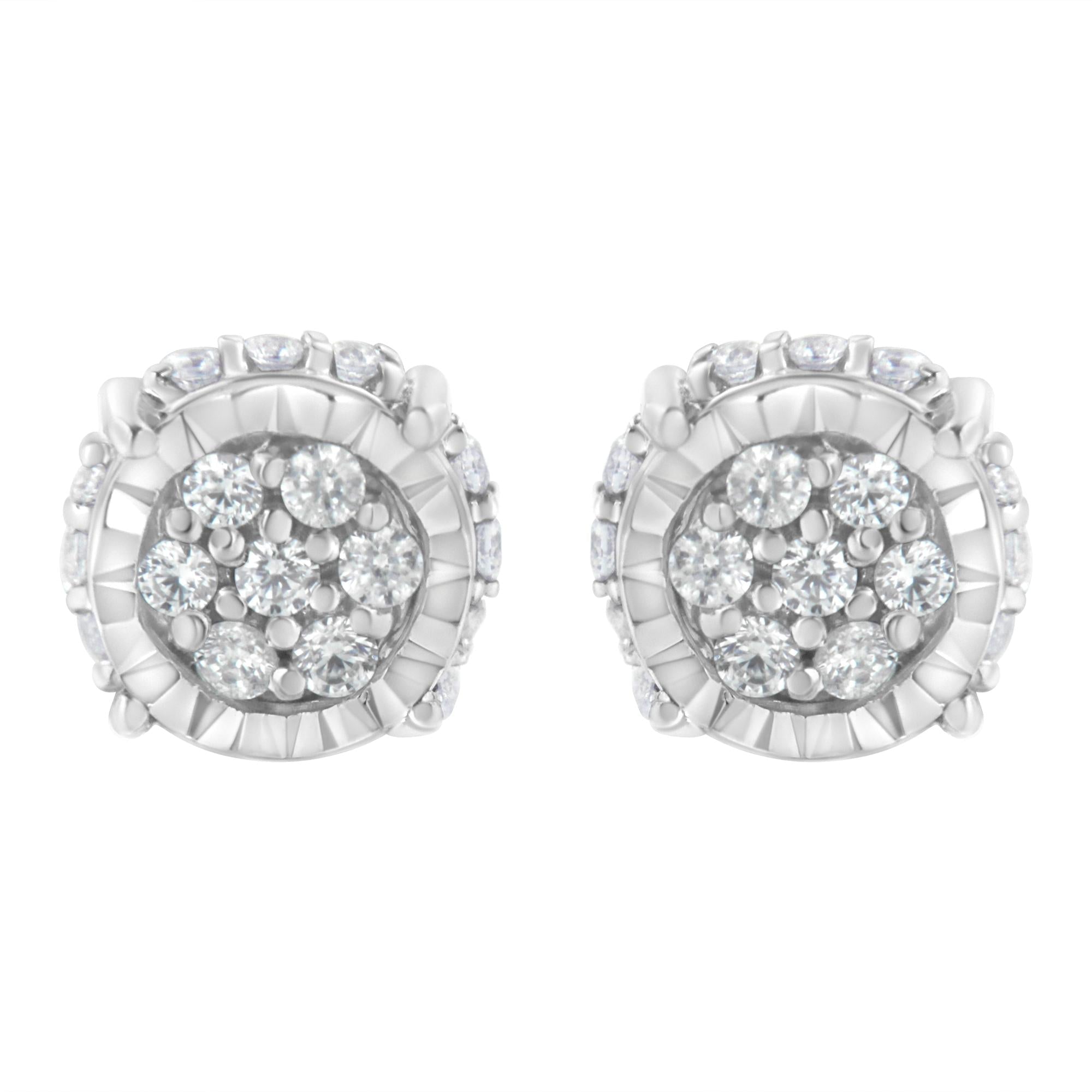 These delicate stud earrings have a unique design. Crafted in sterling silver, these earrings showcase 1/3ct TDW of promo quality diamonds. 7 round cut diamonds sit at the center of a circular stud. Surrounded by a silver halo. Shimmering on the sides of the design additional round diamonds adorn the studs. A push back mechanism keeps the earring secure and you worry free. Promo quality diamonds are on the lowest of diamond color and quality scale. Round-cut, promo quality diamonds are milky and cloudy in nature. They have asymmetrical ball shape and are filled with inclusions.