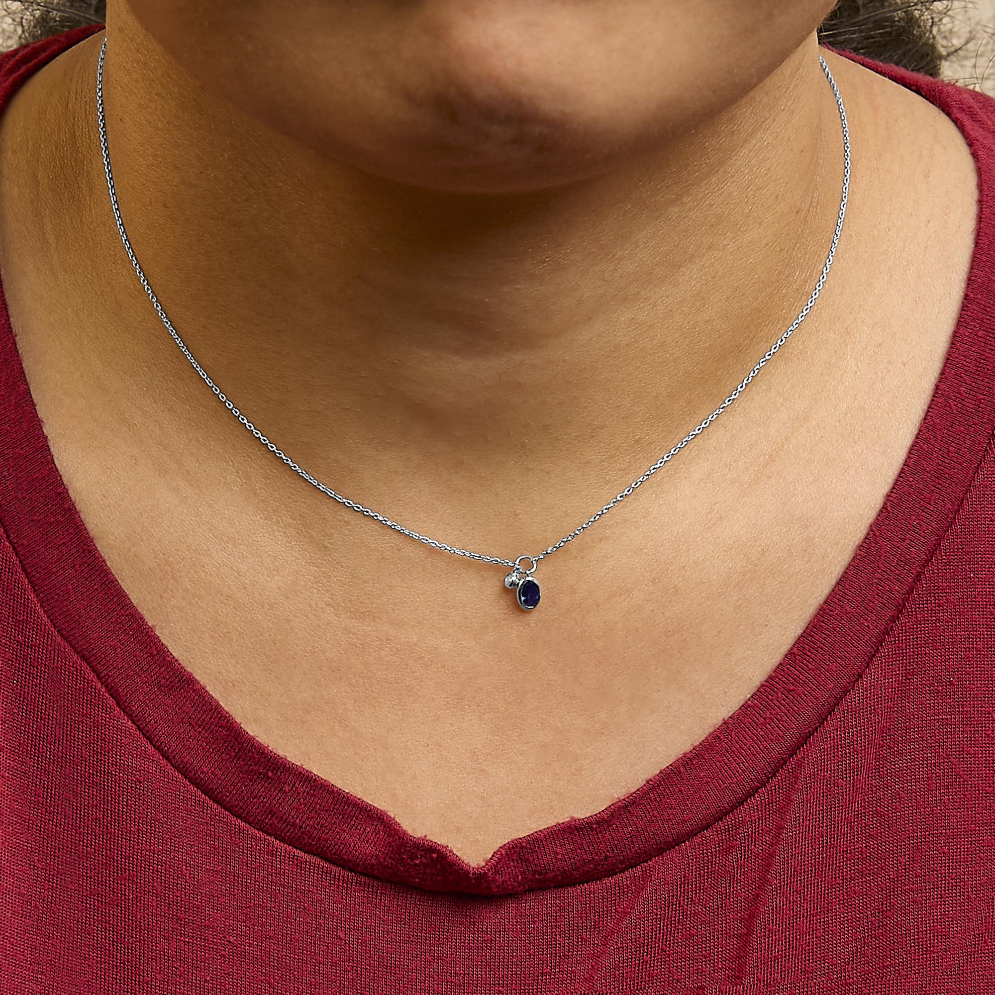 Evoke the essence of timeless elegance with this 10K white gold necklace, glinting with a rhodium finish to ensure an everlasting shimmer. At its heart, the piece features a bewitchingly deep blue, heat-treated natural sapphire, cradled in a bezel setting a testament to refined grace. Accompanying this gem is a lustrous natural diamond, also bezel-set to rotate light magnificently with each movement. This blend of gems delicately dangles from an 18-inch cable chain, secured effortlessly by a spring ring clasp, weaving sophistication into everyday wear or enhancing special occasions with its captivating charm.