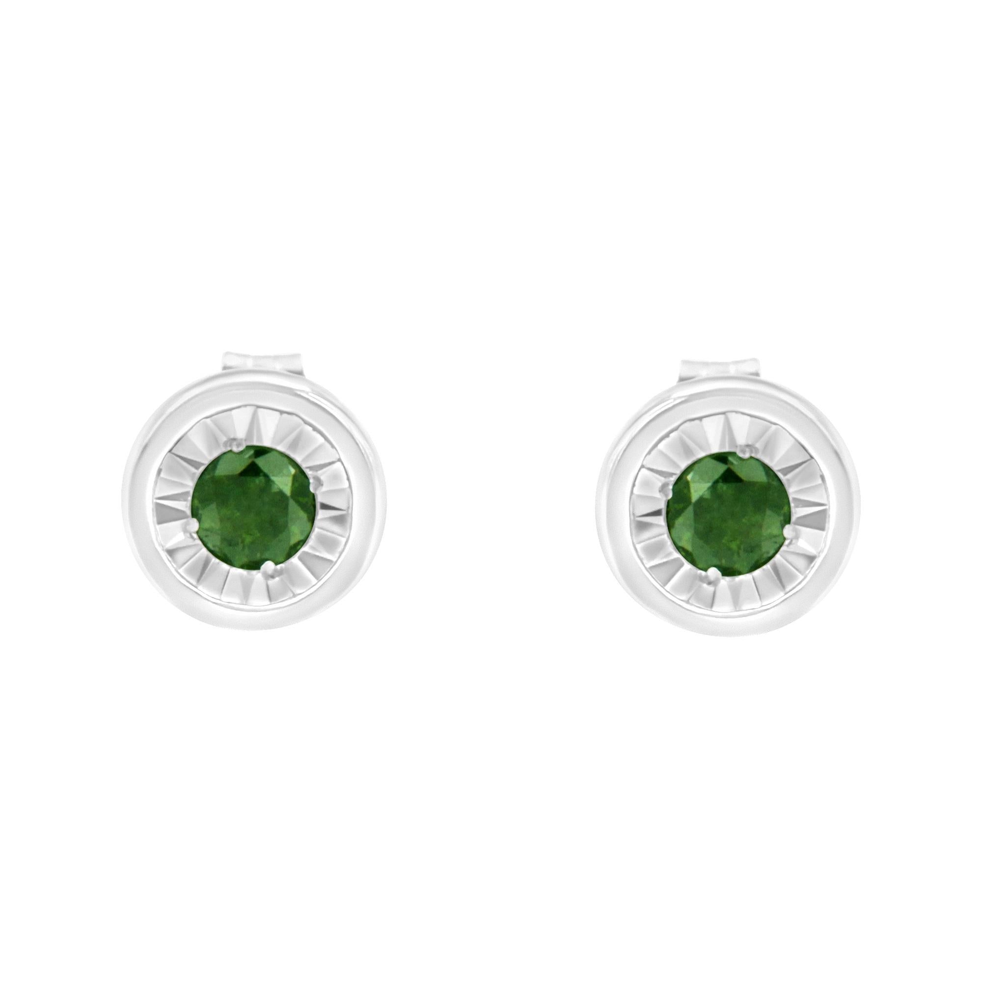 This modern pair of diamond studs features color treated green diamonds in a bezel setting. The sleek design is crafted in a cool sterling silver making them the perfect choice to add a touch of color to everyday wear. Miracle-plate settings with fluted frames magnify and multiple the sparkle of the central gemstones. Push on butterfly backs and notched friction posts ensure secure and worry-free wear.