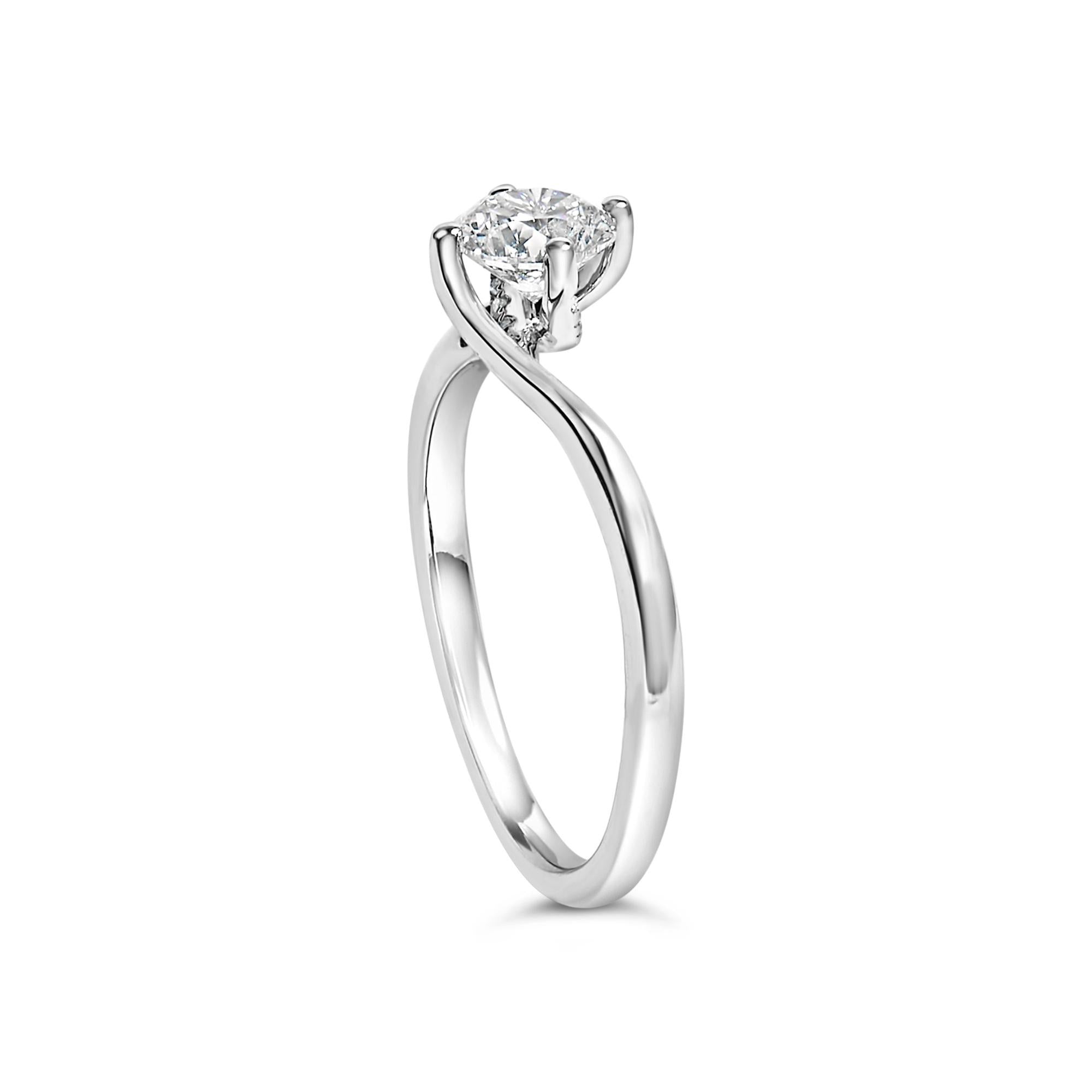 Embrace timeless elegance with this 14K white gold engagement ring, where luxury meets modern craftsmanship. The centerpiece, a lab-grown round brilliant diamond, captivates with white color and near flawless clarity, radiating purity and an immaculate shine. Securely nestled in a four-prong setting, this diamond is a testament to innovation and ethical sourcing. Its band, rhodium-plated for enhanced brilliance, twists artistically to form a unique bypass silhouette that symbolizes the unity and infinite journey of two lives intertwining. Beneath the crown, a discreet halo of micro-paved diamonds adds an enchanting whisper of sparkle, visible only to the wearer and beloved. This ring not only promises a sustainable luxury but also an heirloom-in-waiting that celebrates love with a distinctive flair. Center Stone is 3/4 Ctw.