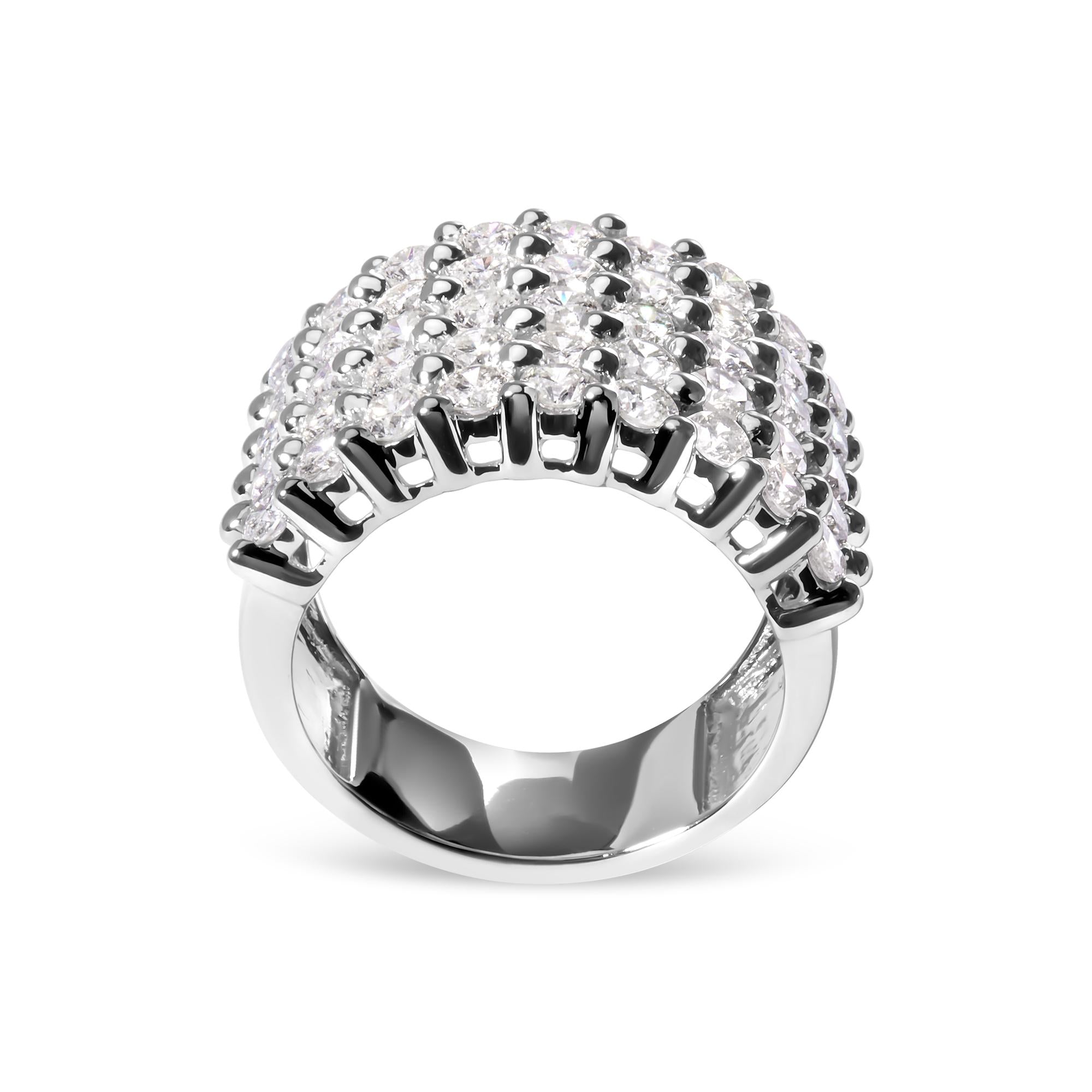 Indulge in the opulence of this exquisite creation, a testament to timeless elegance and impeccable craftsmanship. Five rows of natural diamonds, each hand-selected for their captivating I-J color and I1-I2 clarity, unfurl across the rhodium-plated 14k white gold band, creating a mesmerizing cascade of sparkle and fire. Totaling an awe-inspiring 4.0 carats, these diamonds dance with brilliance, catching every ray of light to enchant and dazzle. The band, with its refined 4 mm width, exudes sophistication and grace, the rhodium plating bestowing a lustrous finish that promises enduring radiance. This ring is not merely an accessory but a celebration of luxury and a promise of eternity. With unparalleled beauty and a design that transcends trends, this masterpiece invites you to adorn your hand with its everlasting allure, becoming a significant piece in your collection and a cherished symbol of elegance.