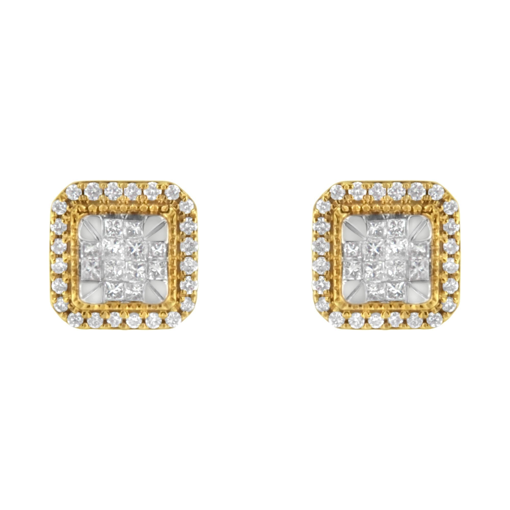 A pair of square diamond cluster stud earring that sparkle with a central cluster of princess cut diamonds surrounded by a halo of round diamonds. Milgrain beading adds a vintage touch to this unique design crafted in 10 karat yellow gold. They have a total diamond weight of 1/2 carat.