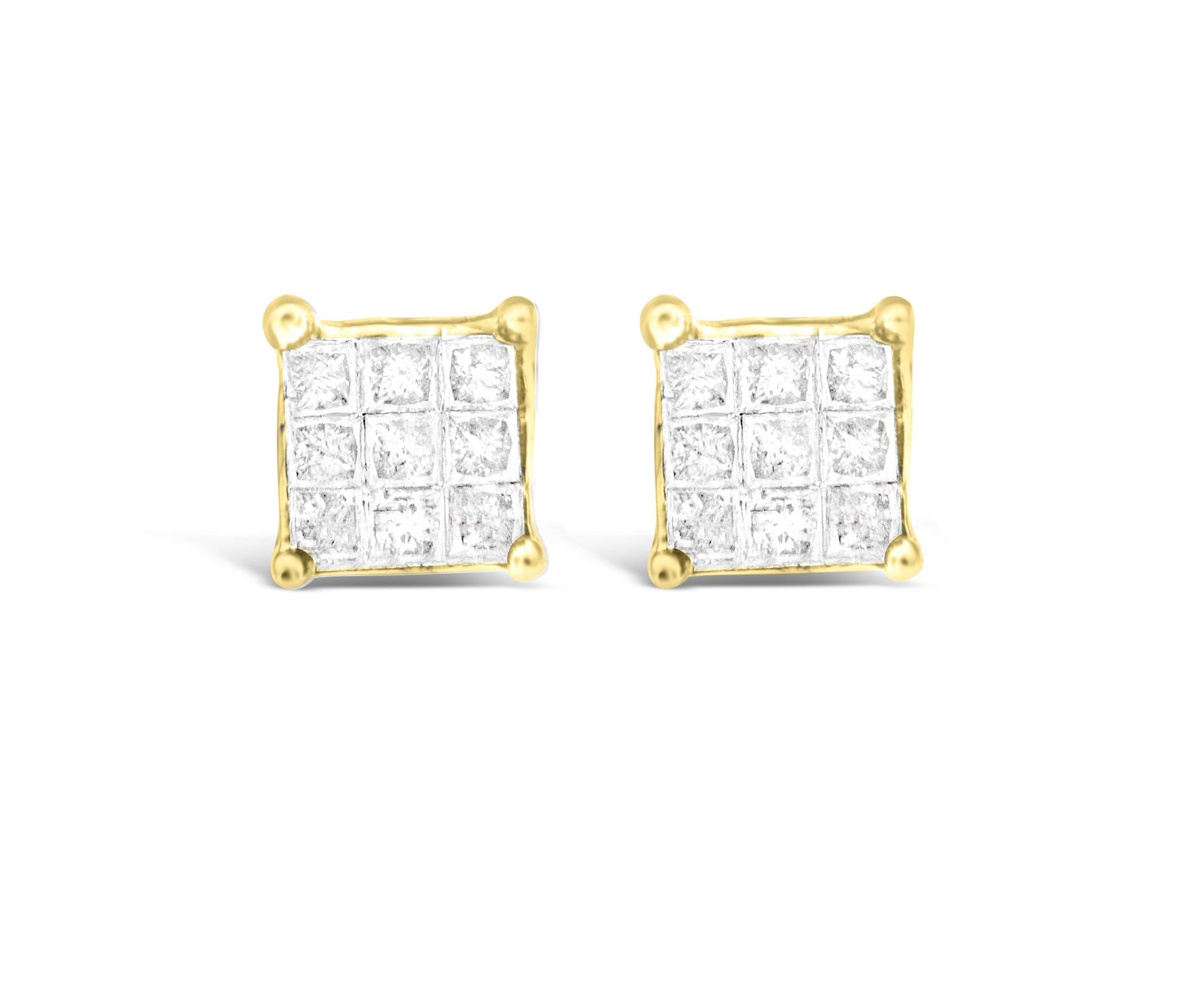 Immerse yourself in the subtle elegance of these 10K yellow gold earrings, where eighteen princess-cut diamonds coalesce into a dazzling composite square, evoking a seamless continuity that enchants the eye. Each natural diamond, curated for a collective 0.25 carat total weight with a J-K color and I2-I3 clarity, sparkles brilliantly against the warm, lustrous backdrop of yellow gold. These meticulously designed adornments are framed with precision, their four-prong setting not only enhancing the stones' radiance but also ensuring their security. The intimacy of the fit is perfected by a classic post and butterfly clasp, promising comfort as you wear them through the days of celebration and the nights of elegance. Here is where timeless craftsmanship meets contemporary charm, ready to complement your every ensemble with a whisper of grandeur.