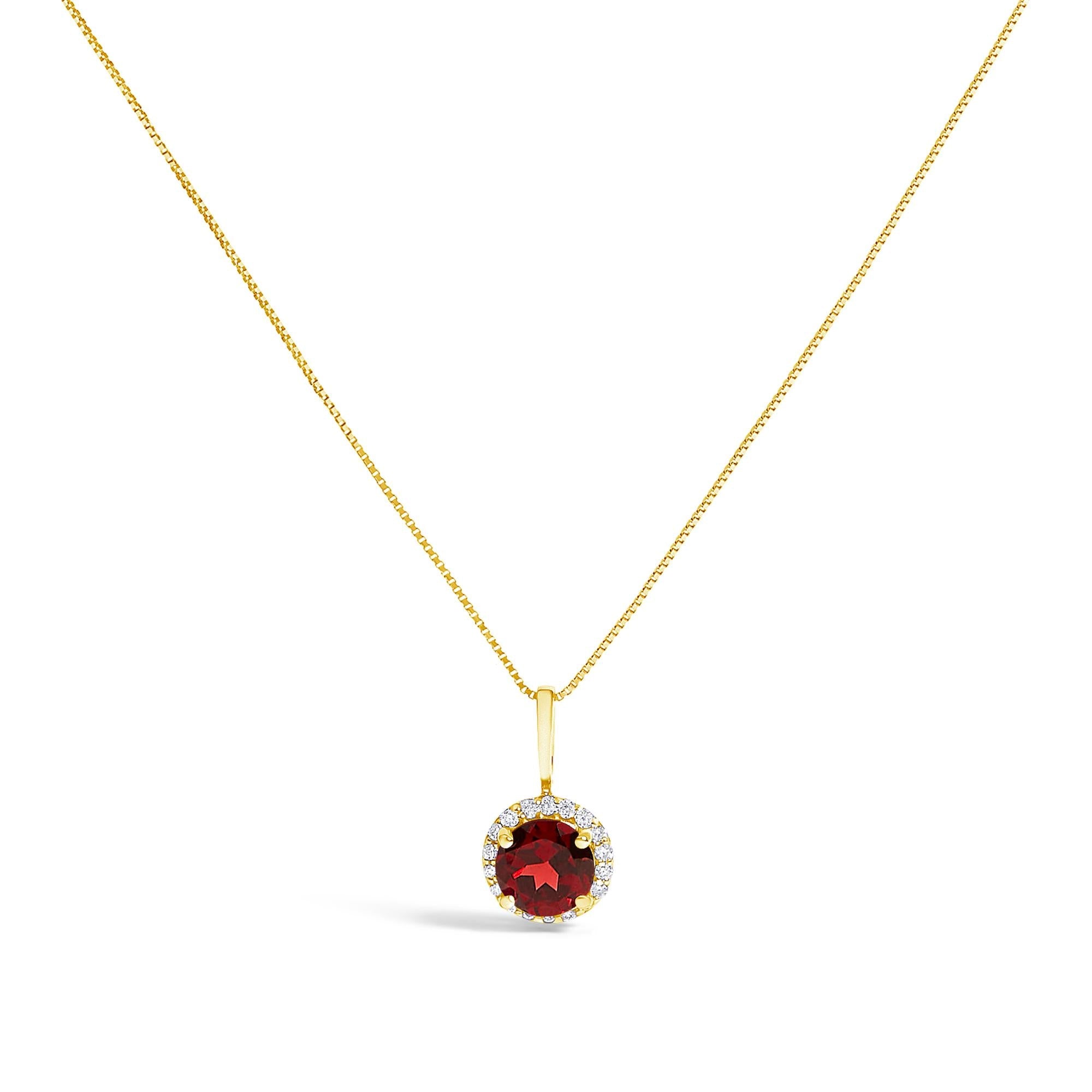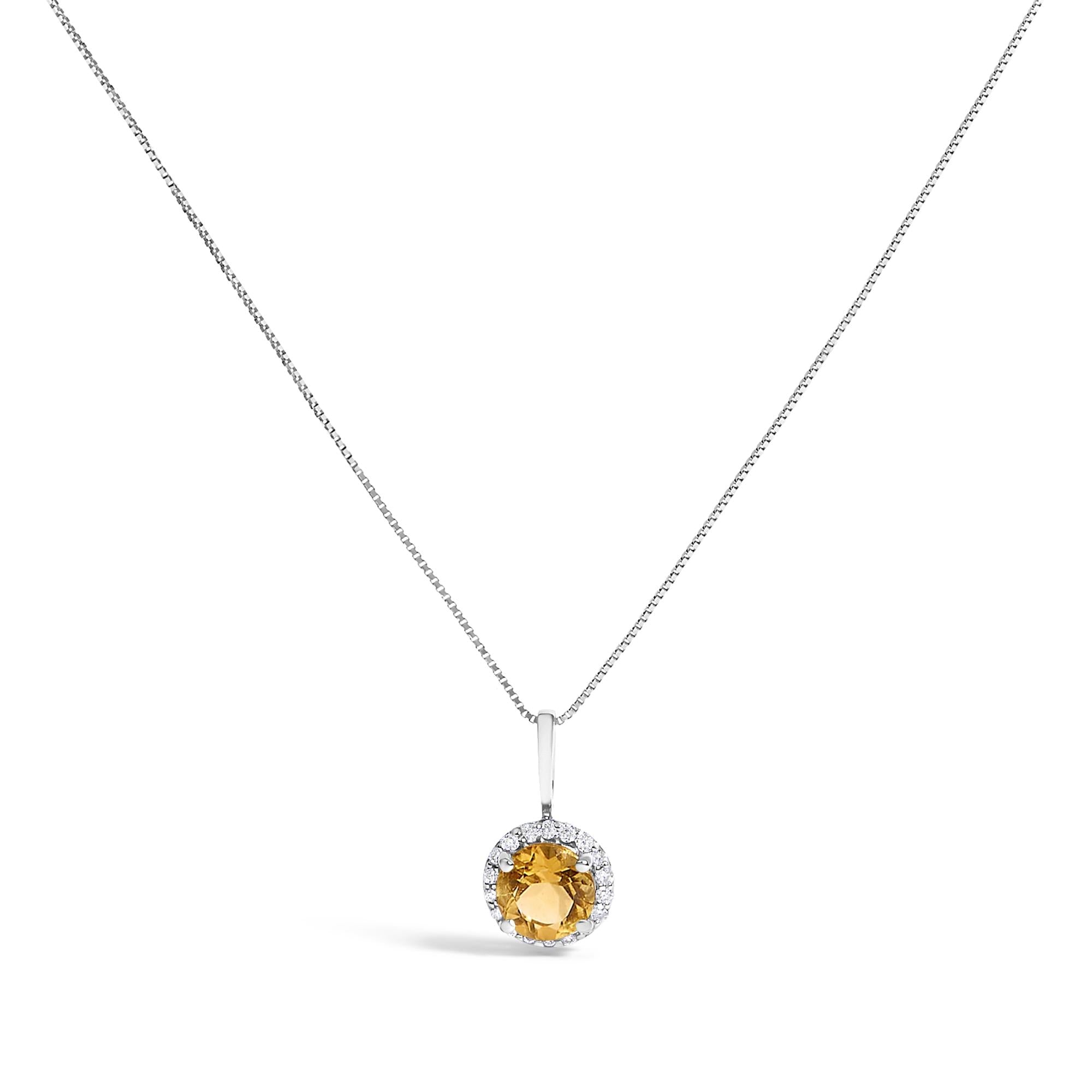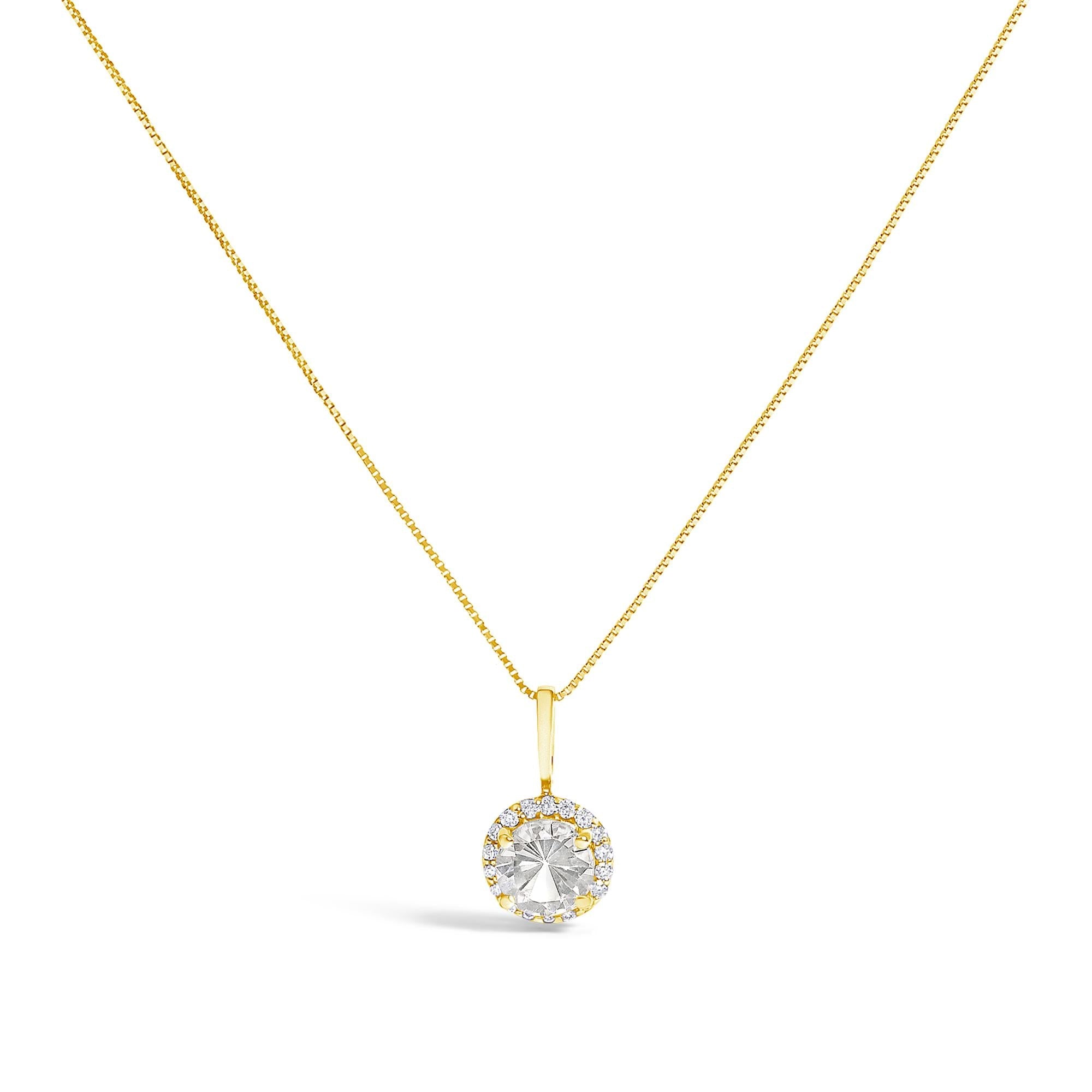 Adorn your neckline with the exquisite allure of this 10K yellow gold pendant necklace, where the warmth of the metal seamlessly complements the fiery depths of a 6mm heat-treated natural white topaz. Graced by the glow of natural diamonds totaling 1/10 carat, each of H-I color and VS2-SI1 clarity, this piece casts a halo of undeniable brilliance around the sumptuous topaz, held firmly by four sturdy prongs. The refined 18-inch box chain with a dependable spring ring clasp elegantly anchors this jewel, creating a delicate yet striking statement of luxury and sophistication that secures your presence in any gathering. This necklace is not just an accessory, it's a testament to refined taste and a penchant for timeless grace.