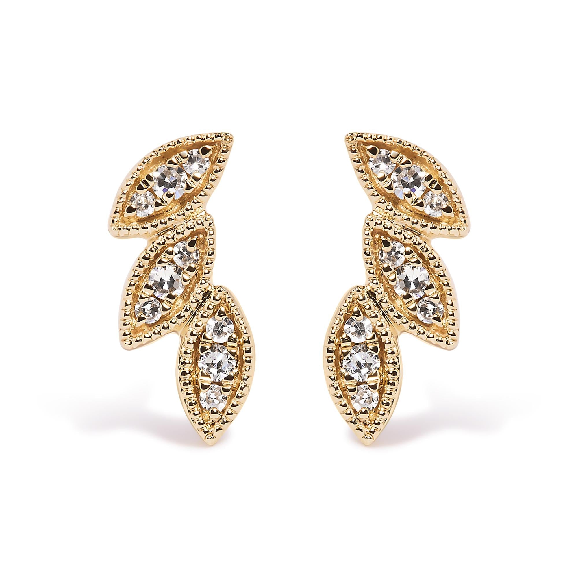 Introducing a breathtaking masterpiece that will captivate every eye it graces. Crafted with utmost precision, these 10K Yellow Gold Stud Earrings feature a mesmerizing triple leaf design, symbolizing growth, prosperity, and the beauty of nature. Adorned with 18 natural round diamonds, totaling 1/10 cttw, these earrings radiate elegance and sophistication. The diamonds, carefully set in a pave setting, showcase a remarkable H-I color, exuding a timeless brilliance. With a touch of feminine charm, these earrings are designed for women who appreciate the finer things in life. Finished with push back findings, these earrings ensure a secure and comfortable fit. Indulge yourself or surprise a loved one with these exquisite leaf-inspired earrings, a true testament to the allure of nature's beauty.