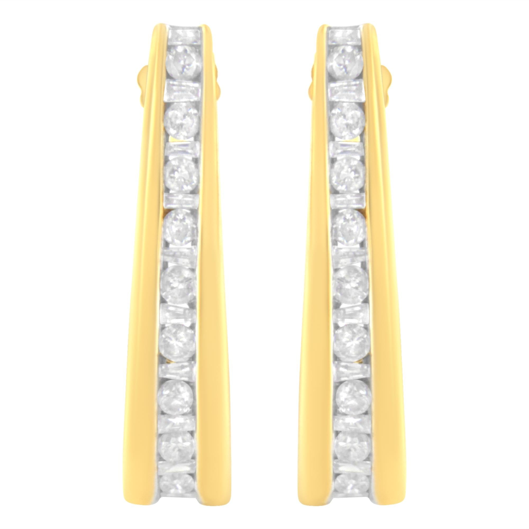 Simple and elegant, these diamond J hoop earrings are perfect for any occasion. Created in 10k yellow gold, this design features sparkling round and baguette cut diamonds that alternate and inlay the front edge of the hoop. This piece captivates with 1 ct TDW of diamonds.