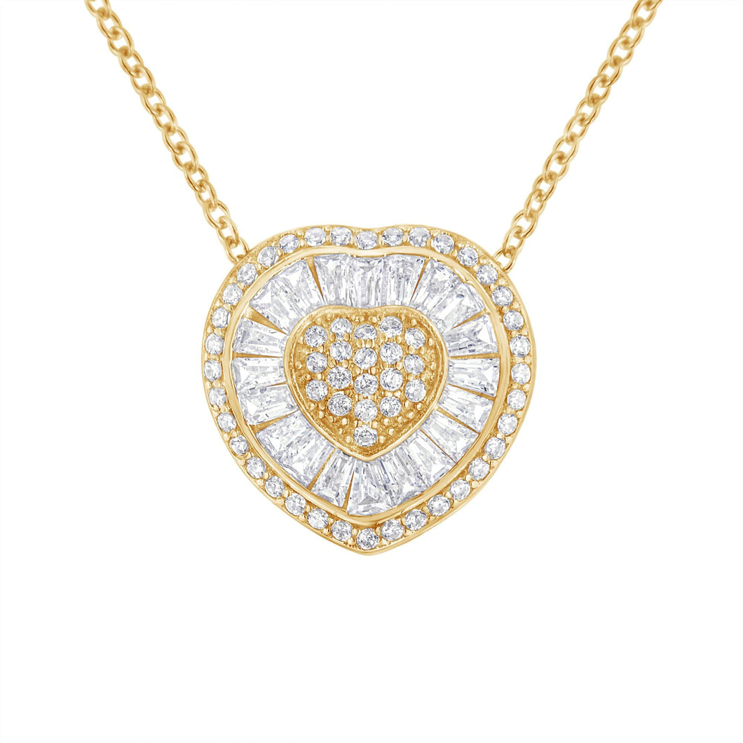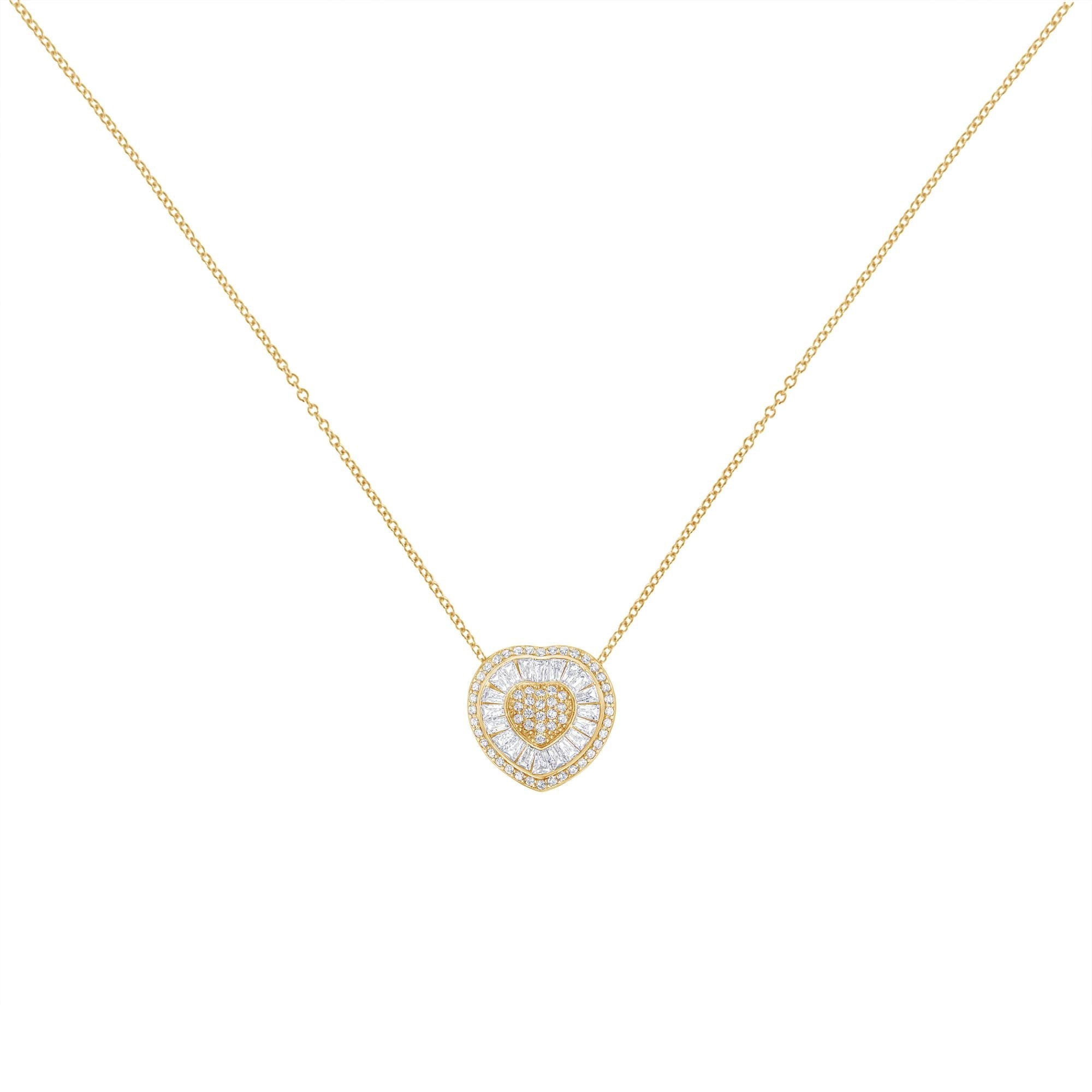 A beautiful gold and diamond heart shaped pendant. This necklace is made with 31 round and 22 baguette-cut diamonds in a prong and channel setting, respectively. The diamonds are set in a lustrous 10k yellow gold, and the pendant comes with a box chain.