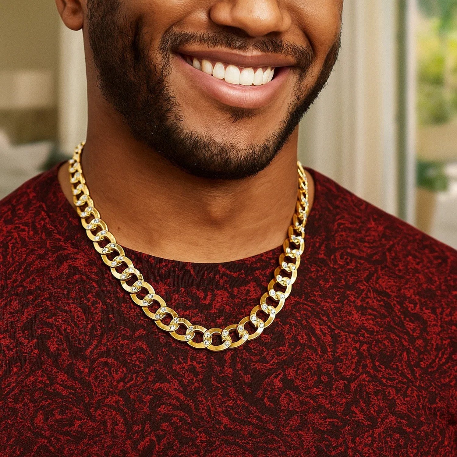This pave curb chain comes in 14k two tone gold and has a width of 11.23 millimeters.