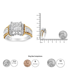 Four gorgeous princess-cut diamonds form the center of this stunning engagement ring for her. A bold border of round diamonds frames the center and is accented with two strands of rope shaped yellow gold. The ring is further elevated by an elegant array of baguette diamonds channel set into the white gold shank. The shank is accented with more yellow gold rope coming down the edges. Impressive with 1 1/2 cts. t.w. of diamonds and a brilliant buffed luster, this engagement ring will leave her speechless.