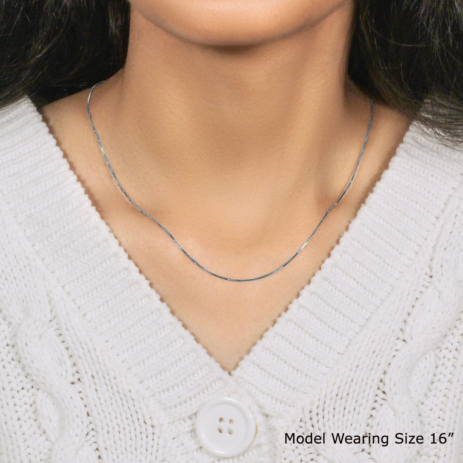 This classic box chain comes in 14k white gold and has a width of 0.7 millimeters.