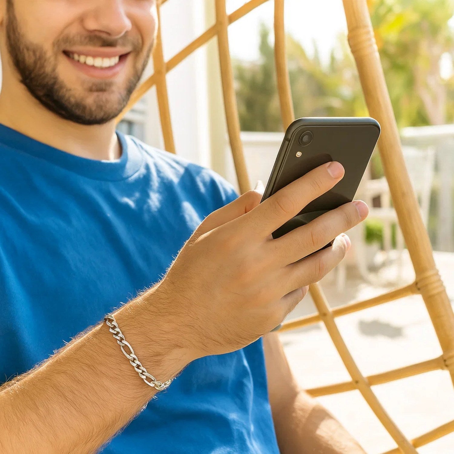 This solid Figaro bracelet comes in 14k white gold and has a width of 6.0 millimeters. Secured with a lobster clasp.
