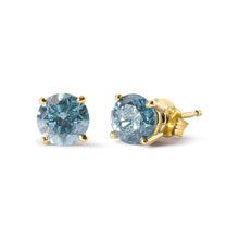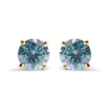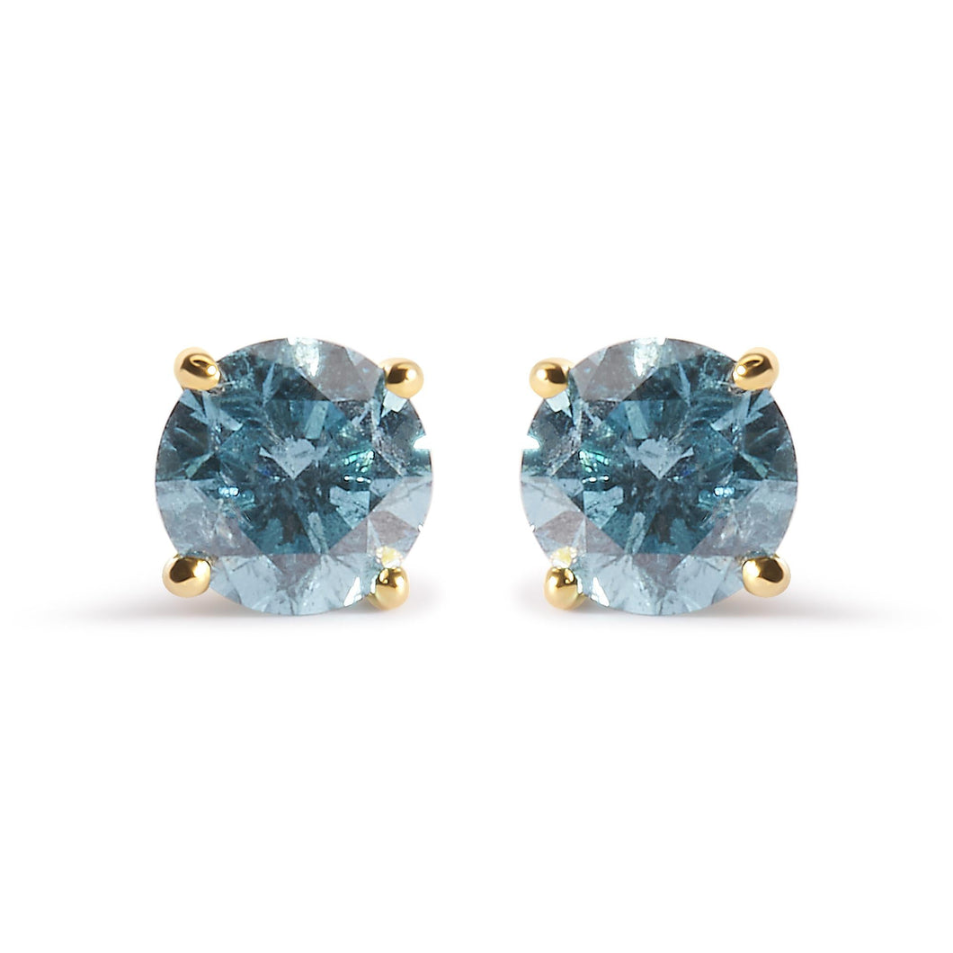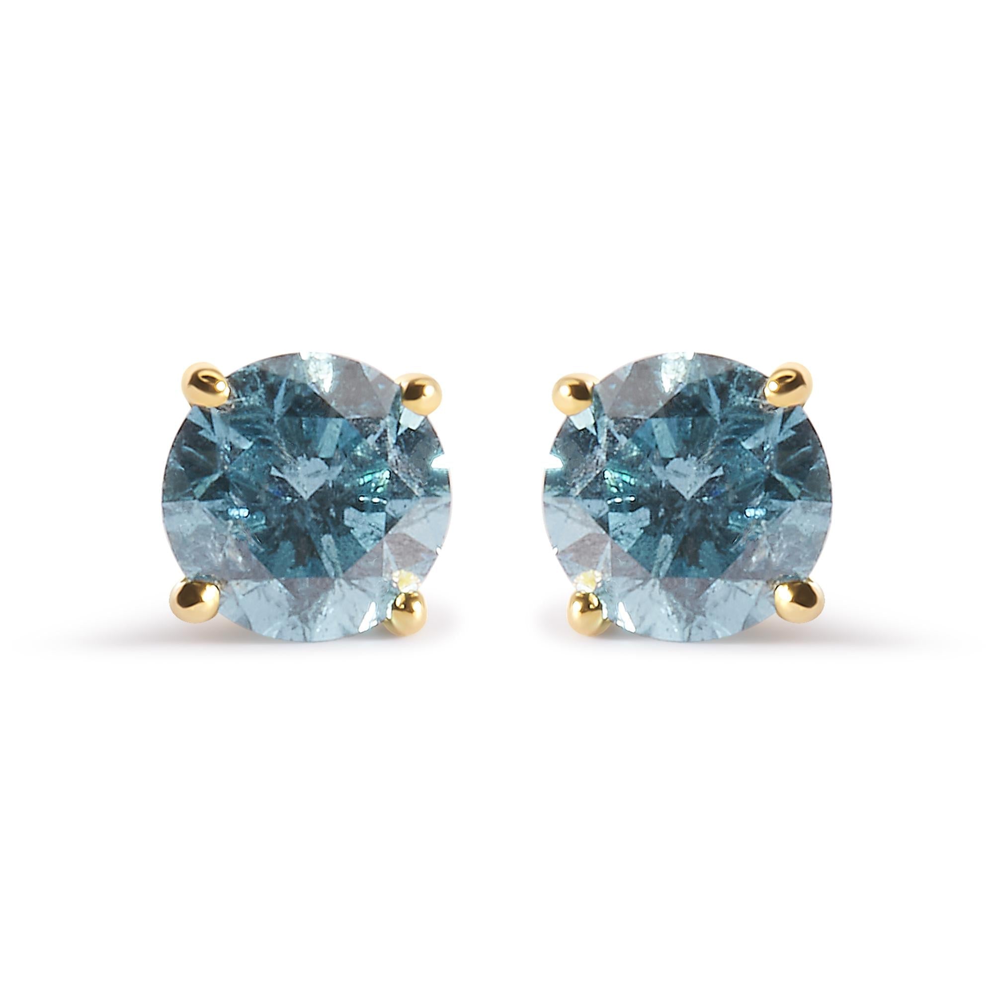 Indulge in the timeless elegance of these 14K yellow gold solitaire stud earrings, featuring two natural round diamonds with a total weight of 1.0 cttw. The treated aqua blue diamonds exude a captivating aqua blue hue that will add a pop of color to any outfit. The 4-prong setting securely holds the diamonds in place, while the push back earring findings ensure a comfortable fit. Perfect for any occasion, these earrings are a must-have for any stylish woman's jewelry collection. Don't miss out on the opportunity to own these exquisite earrings featuring I2-I3 clarity diamonds.