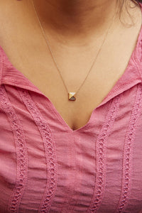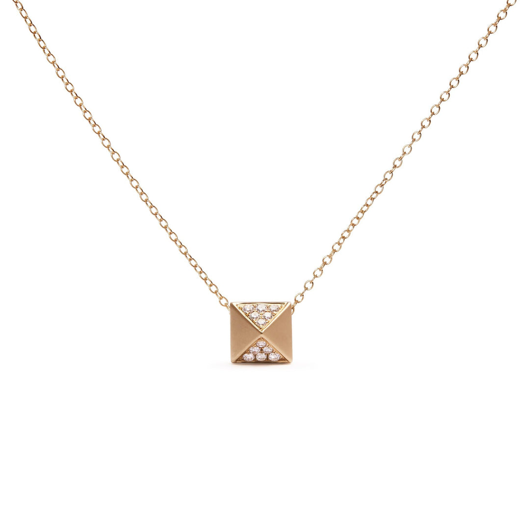 Immerse yourself in the elegance and mystique of this unique 14K yellow gold pendant necklace that captures the essence of classic craftsmanship and contemporary design. The pyramid-shaped pendant boasts a subtly textured matte finish, adorned with a quarter carat of natural white diamonds, whose brilliant sparkle radiates from the top and bottom facets. Each diamond, resplendent in a G-H color and SI1-SI2 clarity, is meticulously arranged to play with light and shadow, embodying timeless beauty with a modern twist. Suspended from a delicate 18-inch cable chain that closes with a seamless spring ring clasp, this necklace is a perfect blend of sophisticated charm and statement style, designed to complement every ensemble with a touch of luxury.