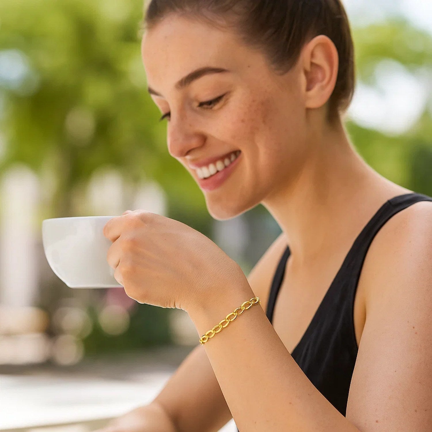 Showcasing polished oval links forming a cable chain this bracelet exudes simple elegance. Available in size 7 1/2 inches this 14k yellow gold beauty comes with a lobster clasp.