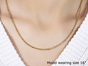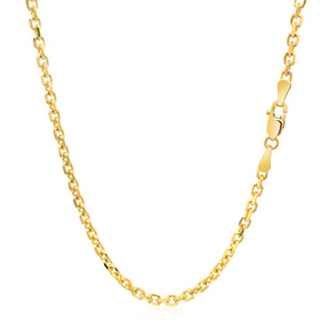 This diamond cut cable link chain comes in 14k yellow gold and has a width of 2.6 millimeters.