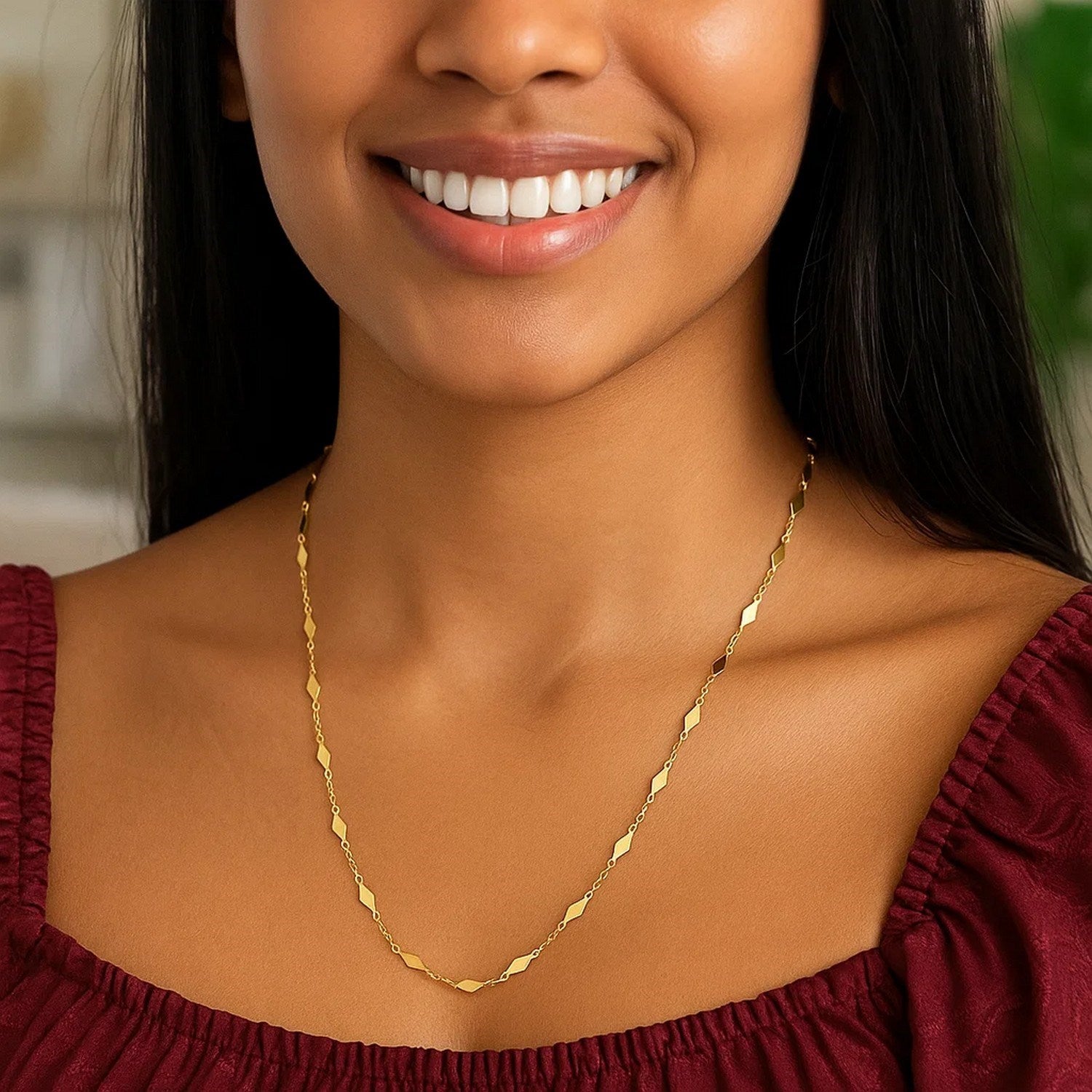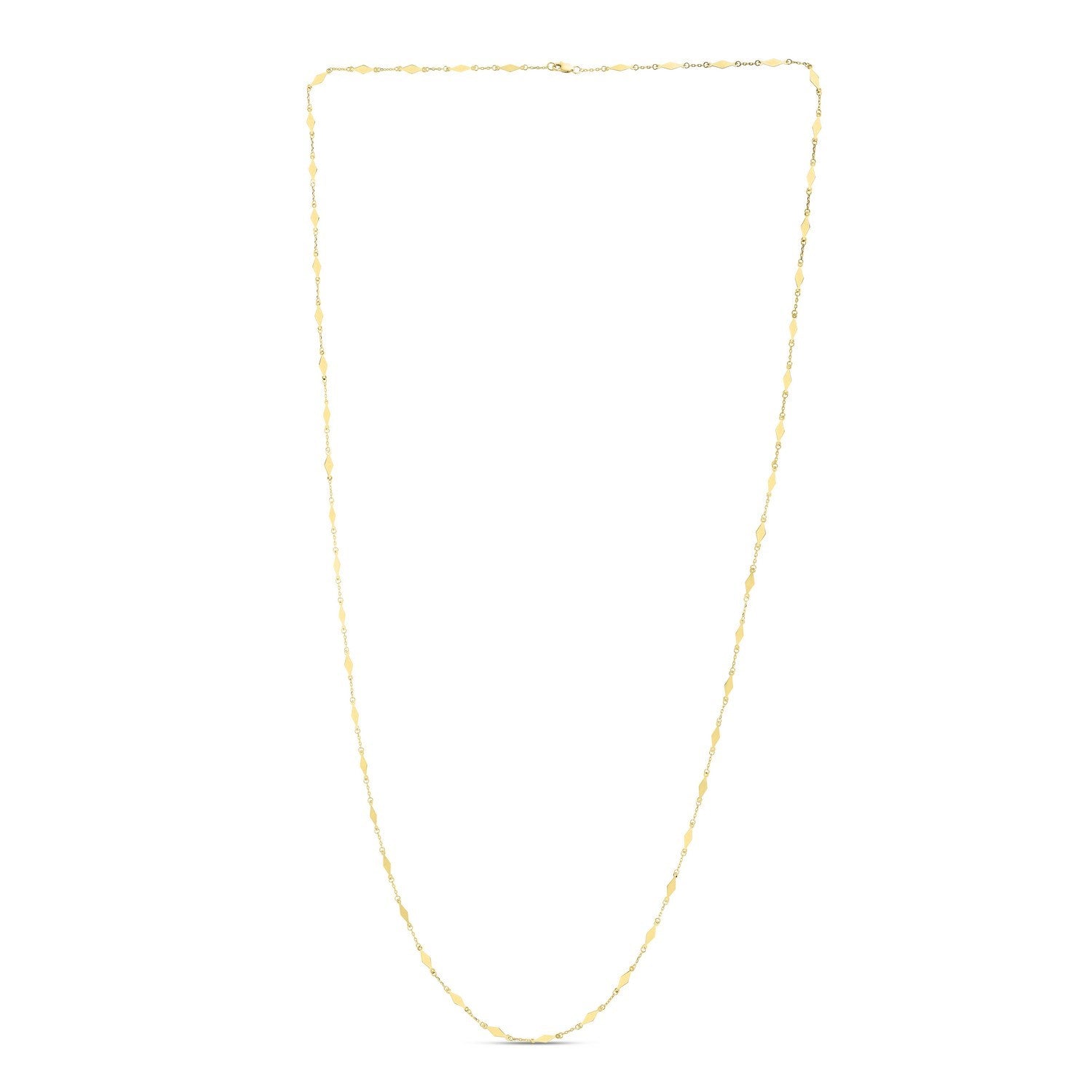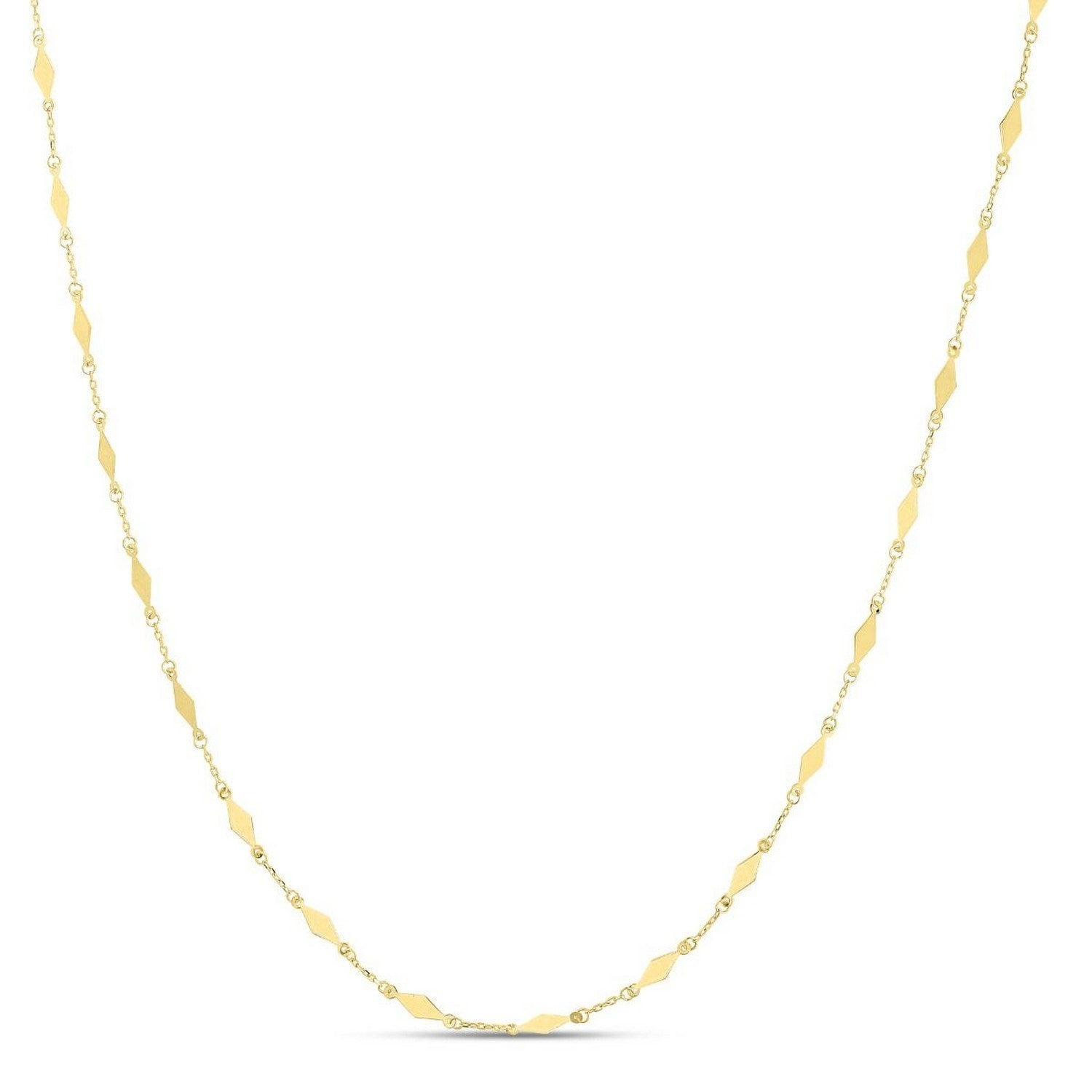 This 14K yellow gold mirror chain necklace features long diamond-shaped stations that reflect light with every movement. Sleek, modern, and radiant, it’s perfect for everyday wear, elegant layering, or adding a touch of geometric shine to any look.