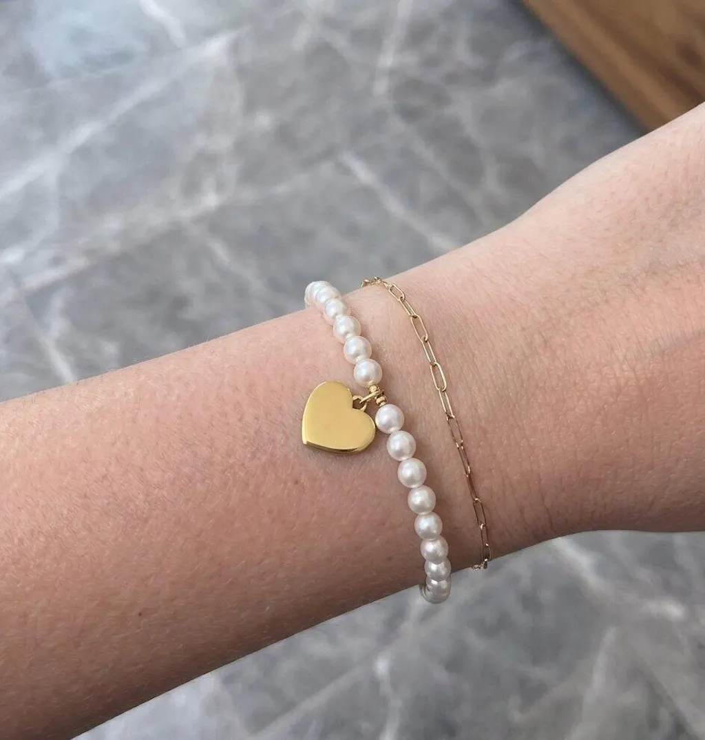 14k Yellow Gold Pearl Heart Charm Bracelet
