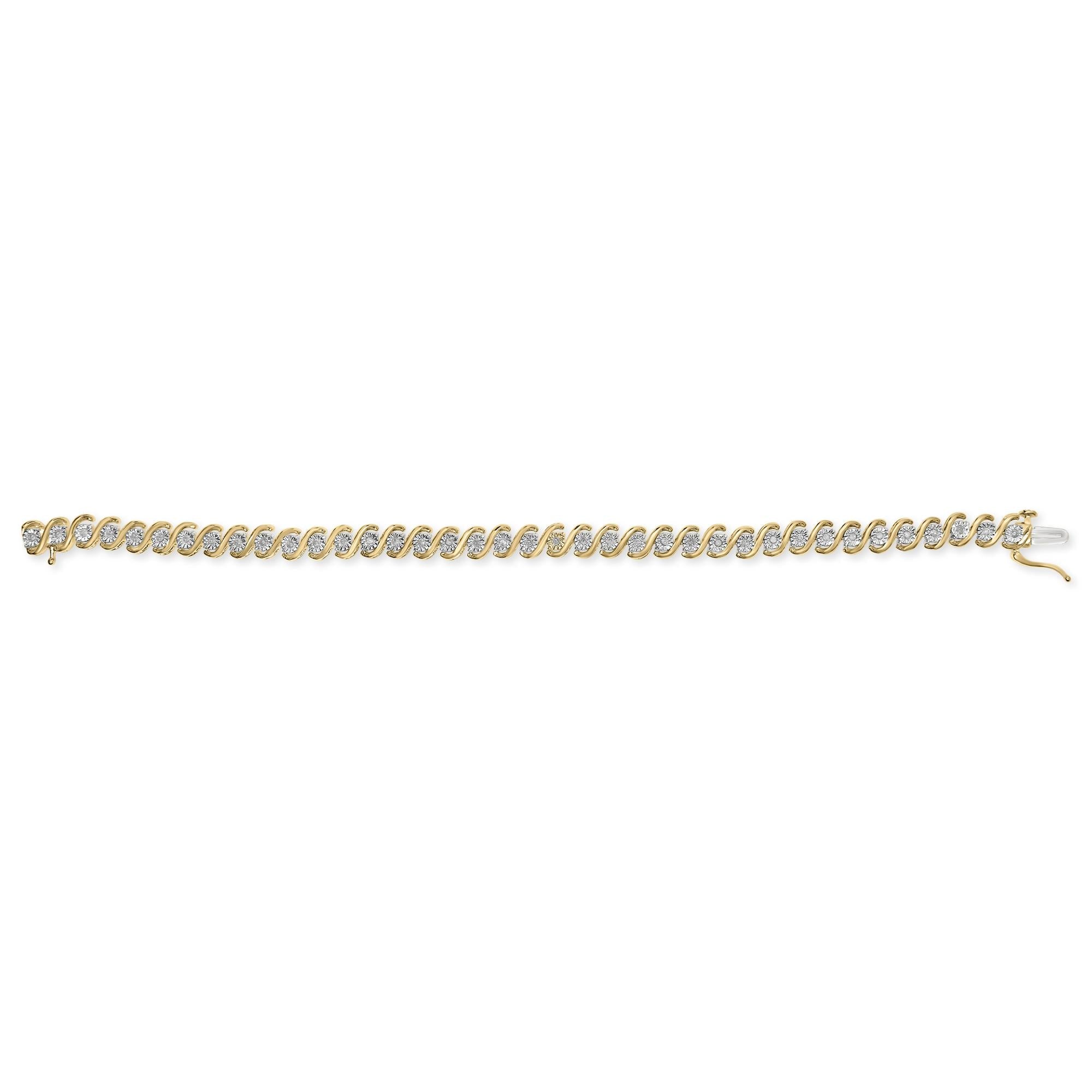 The pinnacle of high style, this fascinating tennis bracelet dazzles with round diamonds designed with a unique, stone enhancing miracle plate setting. A polished 14k yellow gold plated .925 sterling silver wraps the diamonds in a poised beauty that serves to enhance the diamond's natural beauty. The look concludes with a functional box clasp for secure wearing. The diamonds are a total 1/2 cttw and are of an approximate I-J color and I3 clarity. This bracelet is 7 inches long, best for small and medium sized wrists.