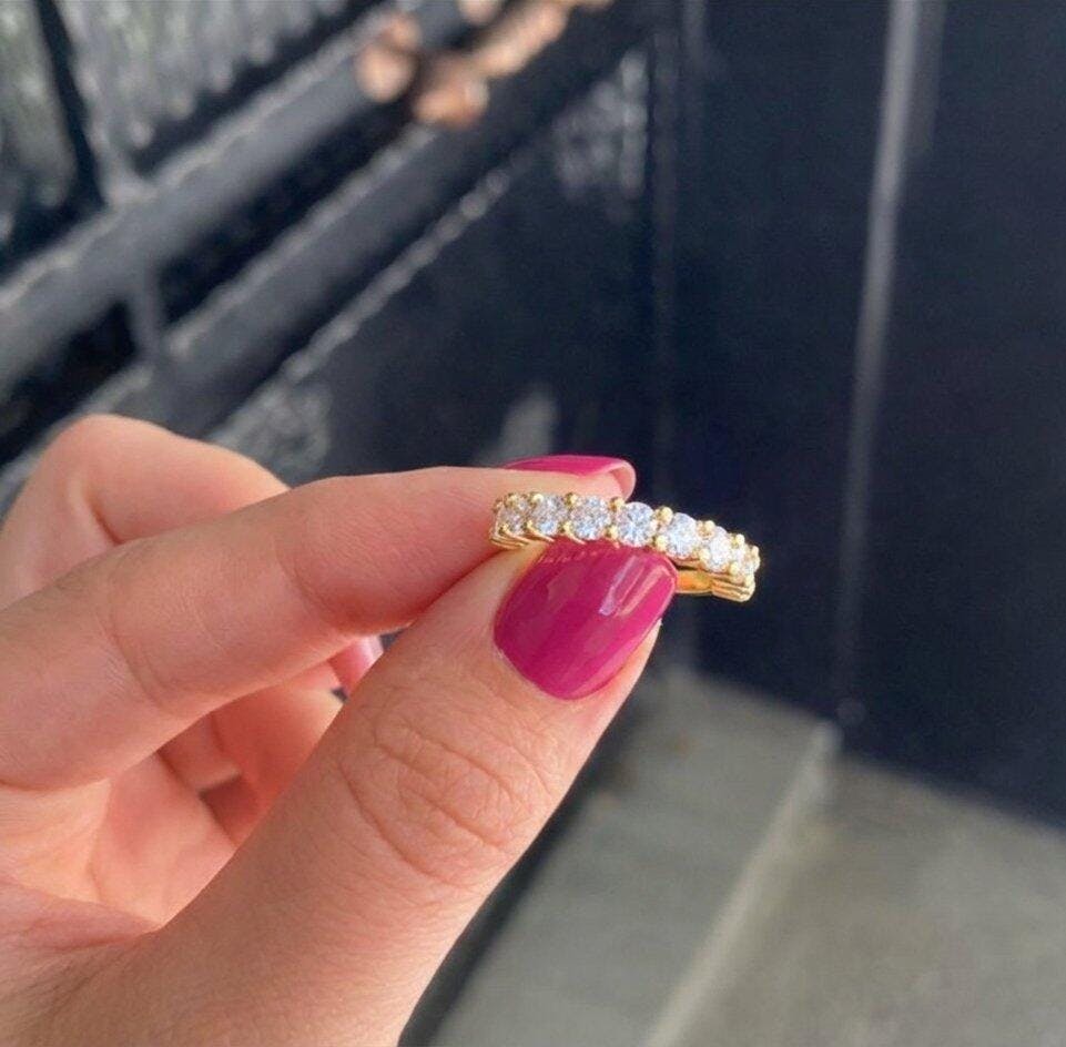 This modern twist on a classic anniversary band ring features shining 14k yellow gold plated .925 sterling silver and 11 round-cut diamonds in a prong setting. This piece is crafted of real 92.5% sterling silver that has been electro-coated with genuine rhodium (a platinum-family metal), a precious metal that will keep a tarnish-free shine for years to come. The diamonds have an impressive total carat weight of 2 cttw which makes this ring a timeless treasure. This piece is the perfect way to display your love front and center.