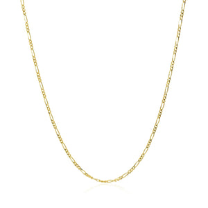 This solid Figaro chain comes in 14k yellow gold and has a width of 1.3 millimeters.