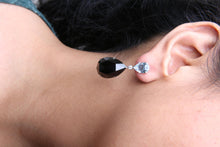 A sultry seduction takes hold of these gorgeous dangle drop earrings crafted of genuine 18k white gold, a metal that will stay tarnish-free for years to come. The upper dangle sets a glamorous start with a natural 12x10mm pear-cut heat-treated sky blue topaz gemstone in a 4-prong setting. On each earring rests round, prong-set diamonds that total 1/5 cttw with an approximate G-H Color and SI1-SI2 Clarity. The lower dangle is an eye-catcher! A natural 25x18mm pear-cut heat-treated black onyx gemstone shows off in a 4-prong setting in a flirty style you'll love to wear. These pierced earrings secure in the ear via push back findings.