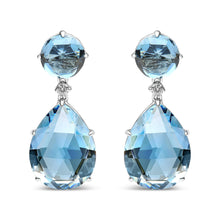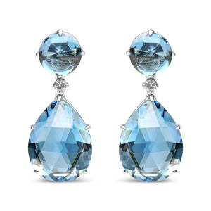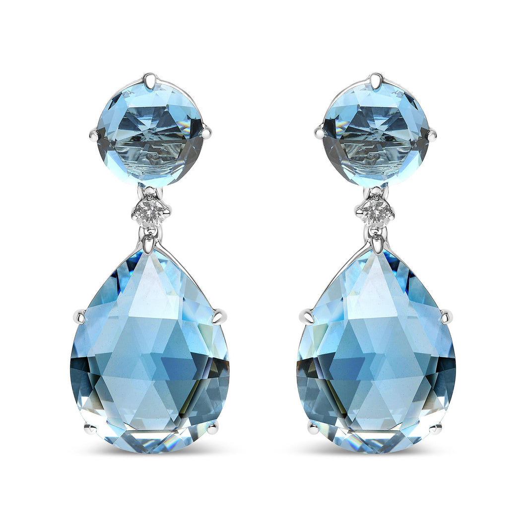 These attractive dangle earrings cultivate a sophisticated style in genuine 18k white gold with natural gemstones and diamonds in a linear design. The upper dangle shows off with a gleaming round color-treated London blue topaz gemstone in a prong setting. Directly blow sits a prong-set round white diamond. The sway of these drop earrings focuses around 20 x 15mm pear-cut heat-treated sky blue topaz gemstones in prong settings. The diamonds in this pair total 1/5 cttw with an approximate G-H Color and SI1-SI2 Clarity. These pierced earrings are easy to put on and take off with secure push back findings.