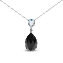 Natural gemstones and elegant aesthetic appeal make this 18k white gold pendant necklace an instant beauty. The centerpiece is an eye-catching 25x15mm pear cut black onyx in a 4-prong setting with a rich array of glorious facets. A 12x8mm pear cut sky blue topaz glistens in a sparkling fashion from its own 4-prong setting. Nestled between these natural gemstones is a simple round diamond accent stone in a prong setting that imparts a graceful air with an approximate G-H Color and SI1-SI2 Clarity. The contemporary yet classic 18" rope chain secures around the neck with a spring ring clasp.