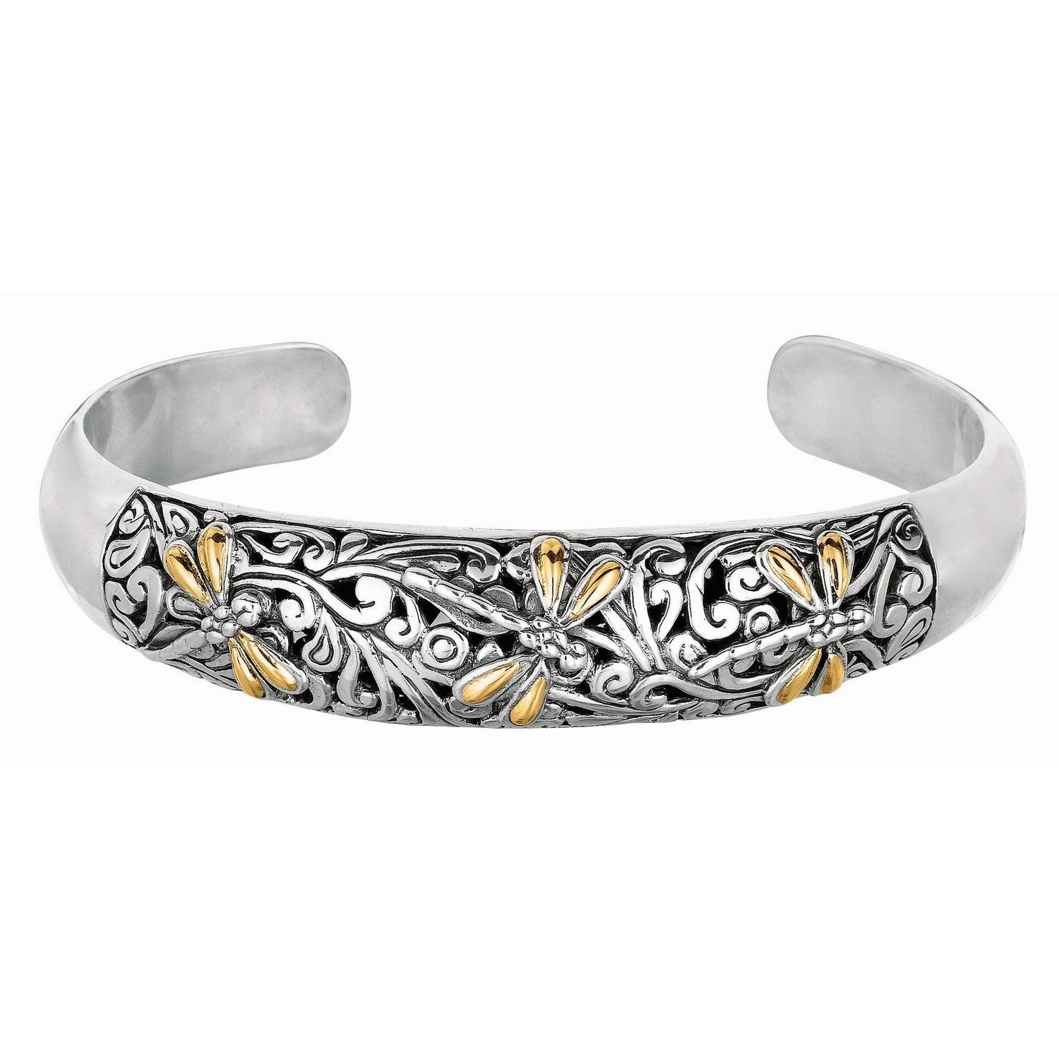 Dragonfly is detailing with beautiful 18k yellow gold wings highlighted with vintage-inspired scrollwork on this open style cuff. Crafted in superb sterling silver.
