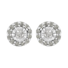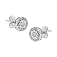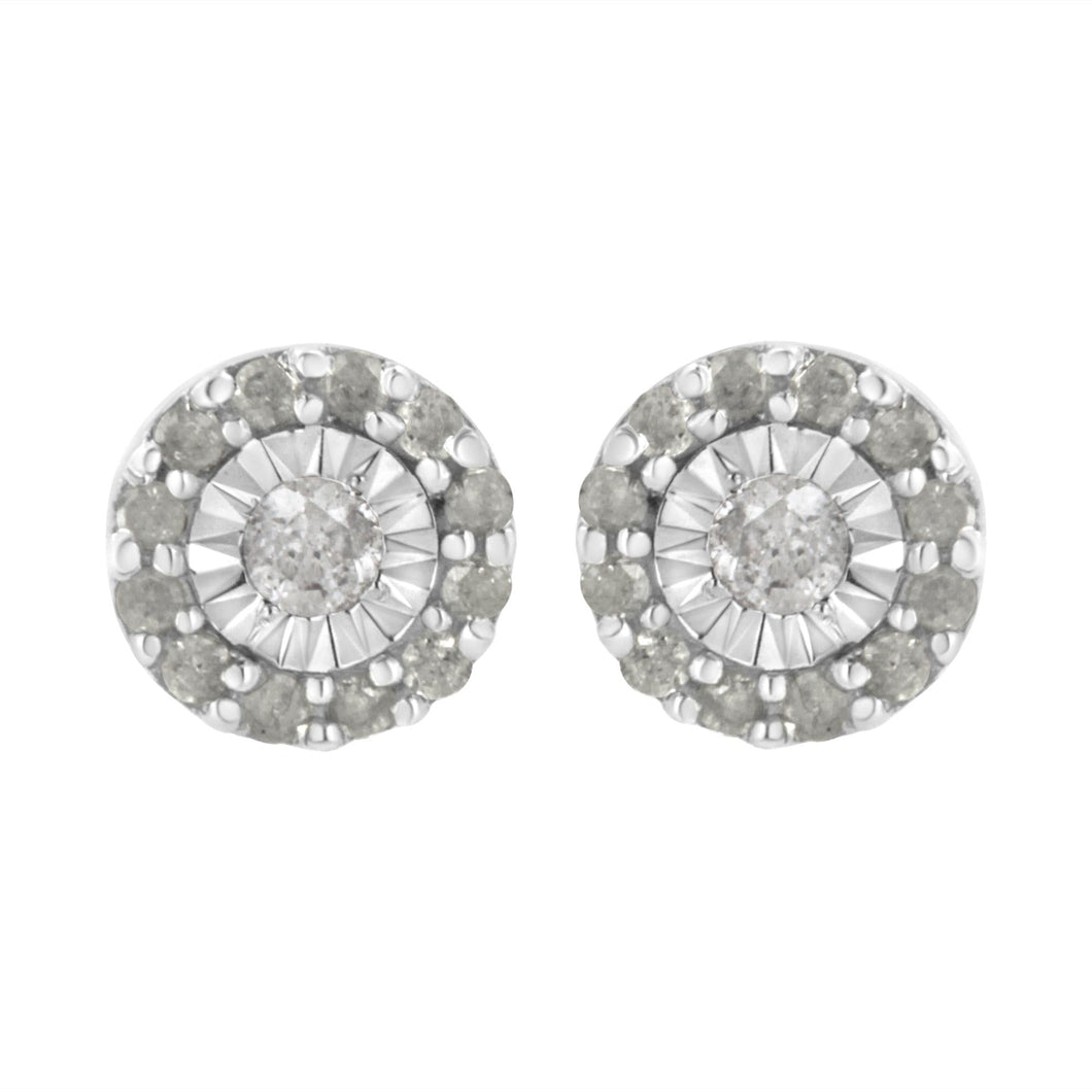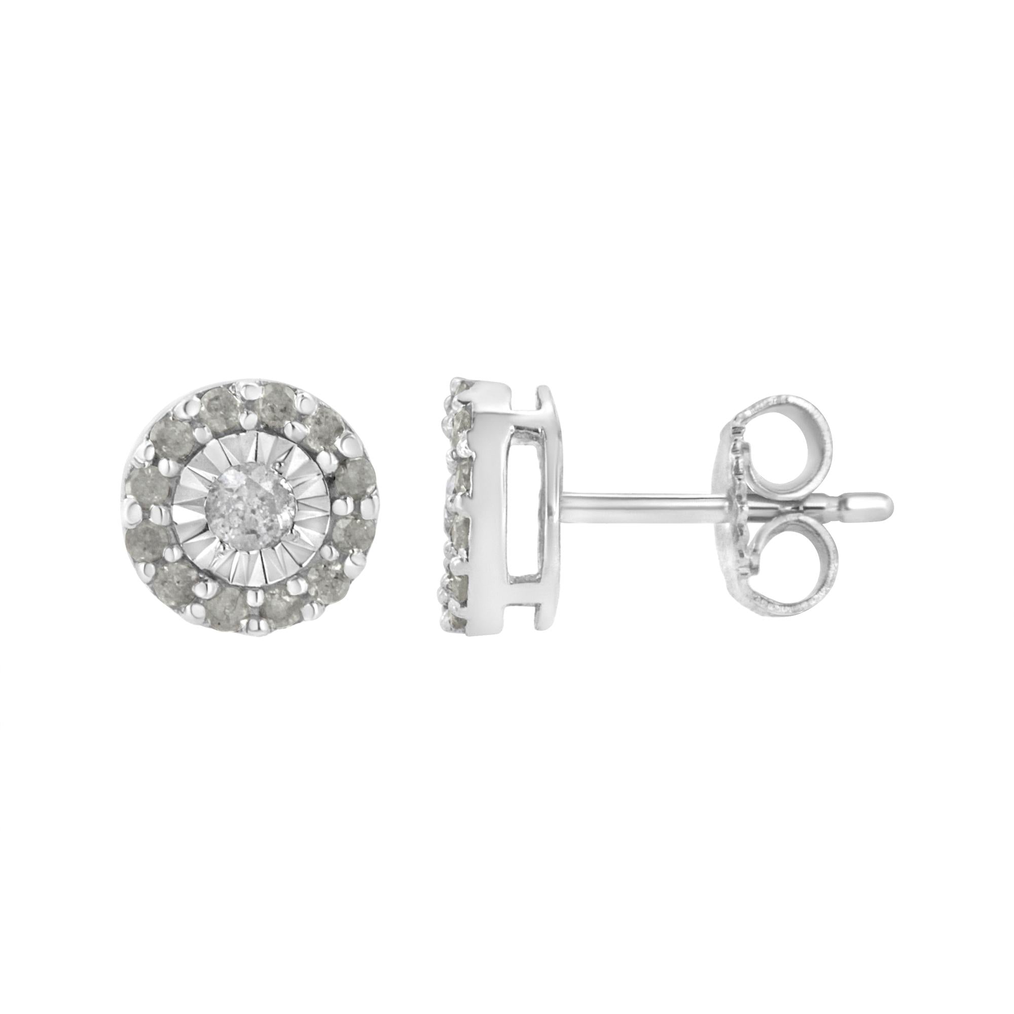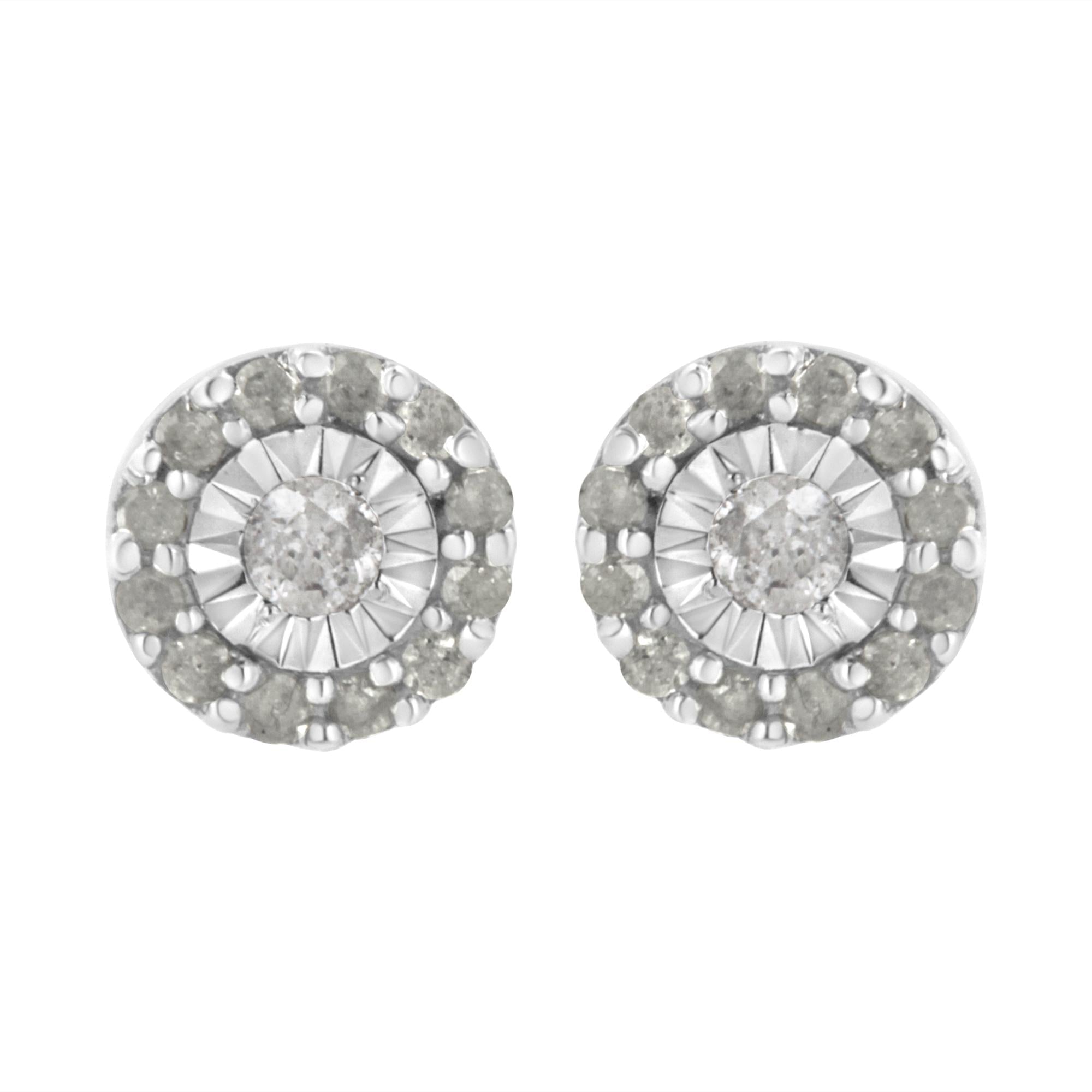 A glistening round cut diamond in a miracle setting sits at the heart of these sterling silver stud earrings. A halo of smaller round diamonds wraps around the central stone. 1/2ct TDW of diamonds shine in these earrings that secure with a push back mechanism.