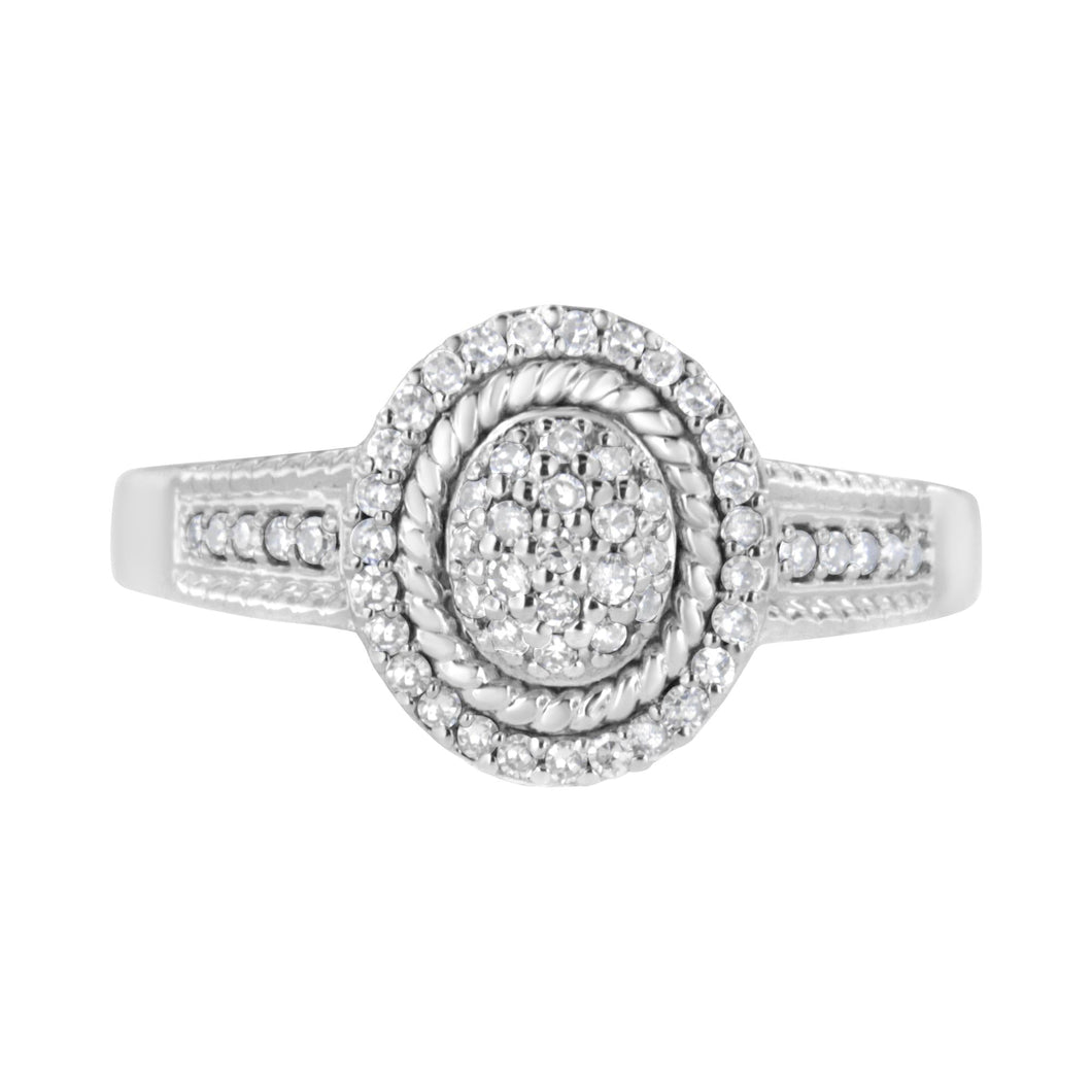 This ring is created in sterling silver and features 1/3ct TDW of diamonds. A glittering round cut diamond cluster sits at the heart of this ring design. A sterling silver rope and a diamond inlaid ribbon create a double halo that wrap around the central cluster. The ring band showcases a row of diamonds held in between a silver rope design.