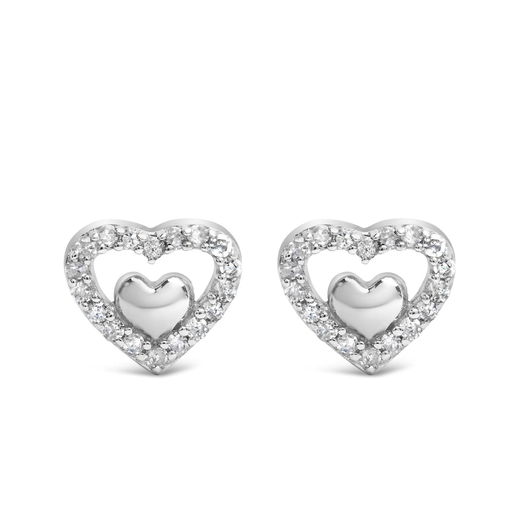Introducing a dazzling masterpiece that embodies love and elegance. These exquisite 925 Sterling Silver Open Double Heart Stud Earrings are a true symbol of affection. Crafted with meticulous attention to detail, these earrings feature 36 natural round diamonds, totaling 1/6 carat. The diamonds, with a stunning I-J color, beautifully complement the .925 Sterling Silver metal. With a push back earring finding, these heart-shaped earrings are designed to effortlessly enhance any woman's grace and style. Embrace the allure of these enchanting earrings, perfect for those seeking a touch of sophistication and romance.