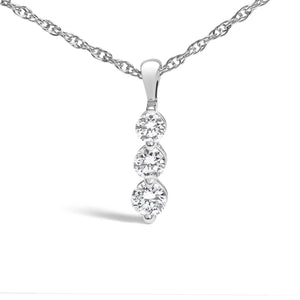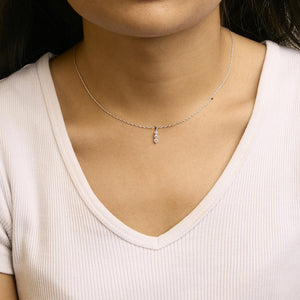 Crafted with an eye for grace and a heart for sustainability, this exquisite necklace dazzles with three lab-grown diamonds, artfully placed to celebrate life's journey: past, present, and future. With a total weight of 1/4 carat, these gems glisten with an F-G color and VS1-VS2 clarity, reflecting not just light but also the depth of your intentions. Nestled in a striking linear setting, the diamonds illuminate their .925 sterling silver canvas, further enhanced by a rhodium plating for extra durability and shine. This piece hangs delicately from an 18-inch rope chain, secured with a resilient spring ring clasp, embodying a commitment as enduring as the memories it honors. Choosing this necklace means embracing a future where beauty and ethics converge.