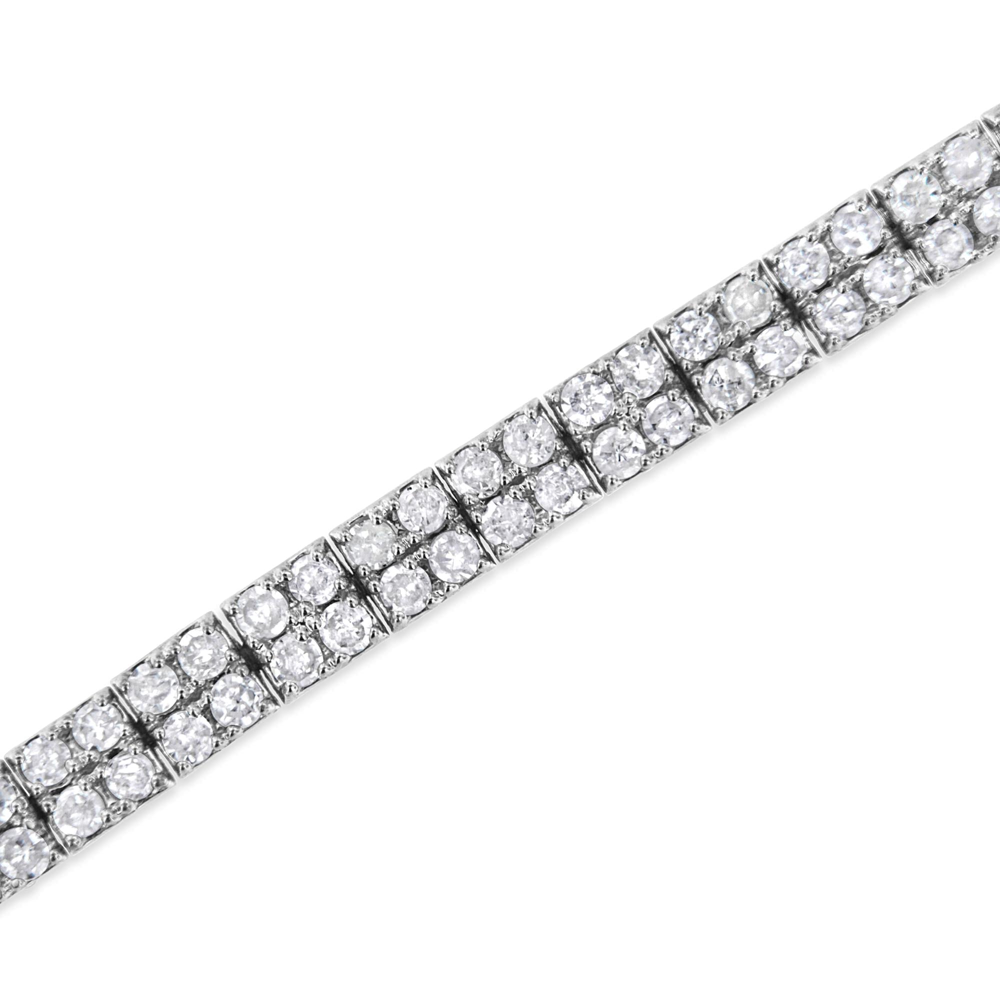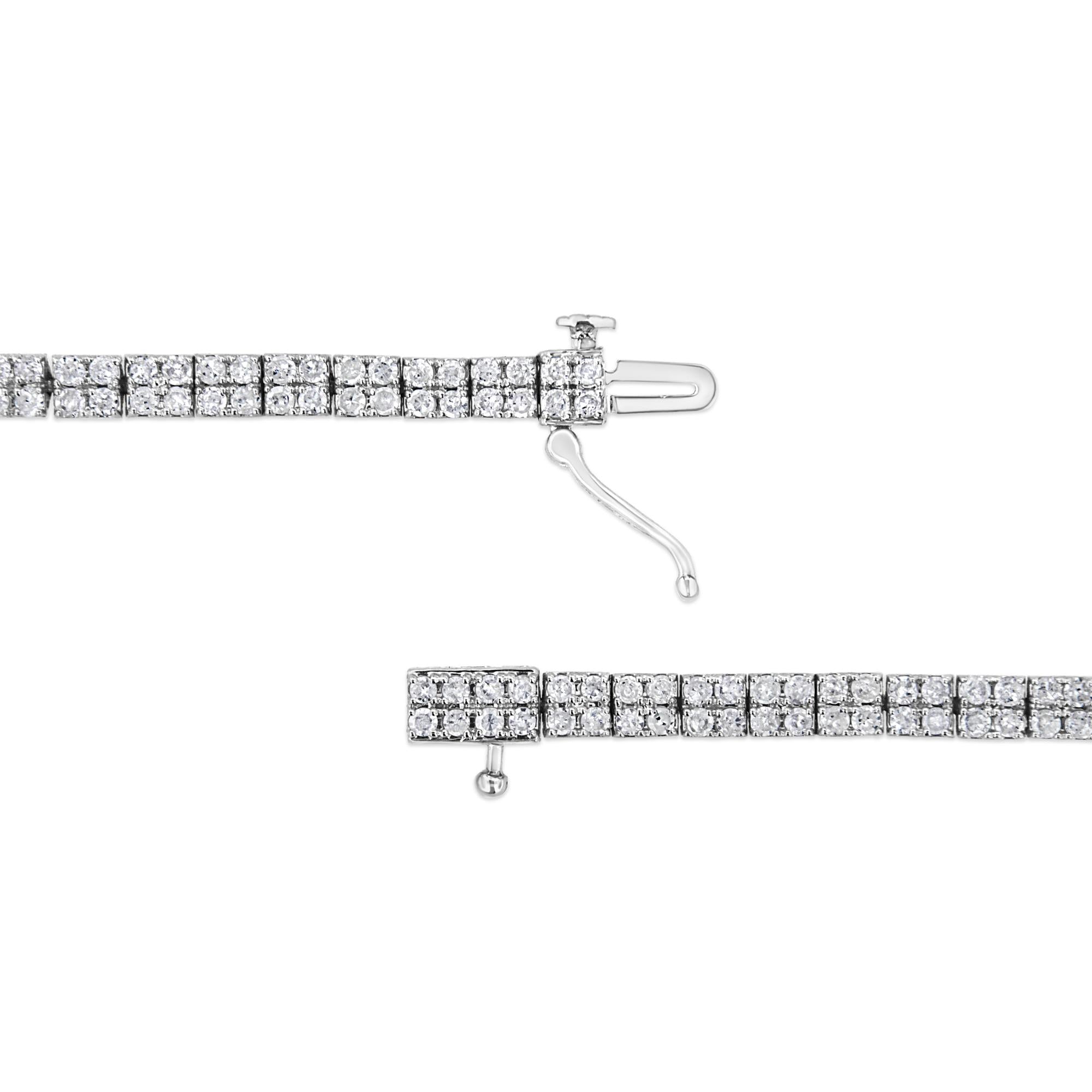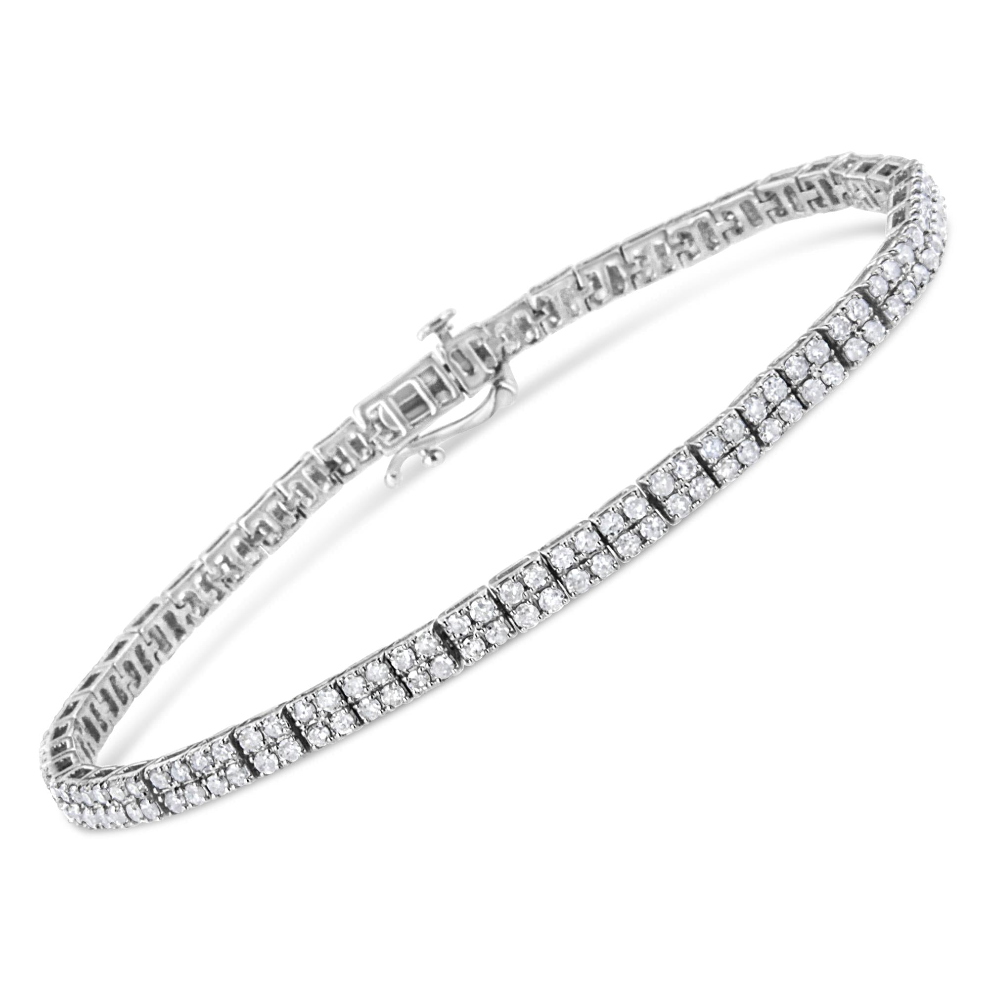 Modern yet timeless, this .925 sterling silver piece is a twist on the classic link bracelet. Silver square links of 4 round-cut diamonds each make up the design of this everlasting piece. The diamonds sit in a striking prong setting, and have a total diamond weight of 3 cttw. It's a classic and feminine piece she'll want to show off every day. Whether worn for daytime glamour or evening sparkle, this bracelet is gorgeously versatile.