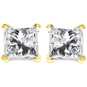 Celebrate any occasion with these classic shimmering diamond stud earrings. Fashioned in 14K yellow gold, each earring showcases a sparkling square shaped, brilliant cut certified diamond solitaire. Dazzling with a bright polished shine, these post earrings secure comfortably with friction posts and butterfly backs. These diamond studs are certified by the AGS as natural, earth mined diamonds. This authentic design is crafted of real 14 karat gold, a precious metal that will keep a tarnish-free shine for years to come. These classic earrings make a great gift for any special occasion! Whether worn for daytime glamour or evening sparkle, these studs are gorgeously versatile. Coordinate these earrings with your favorite diamond necklace or other diamond jewelry to create a complete elegant ensemble.