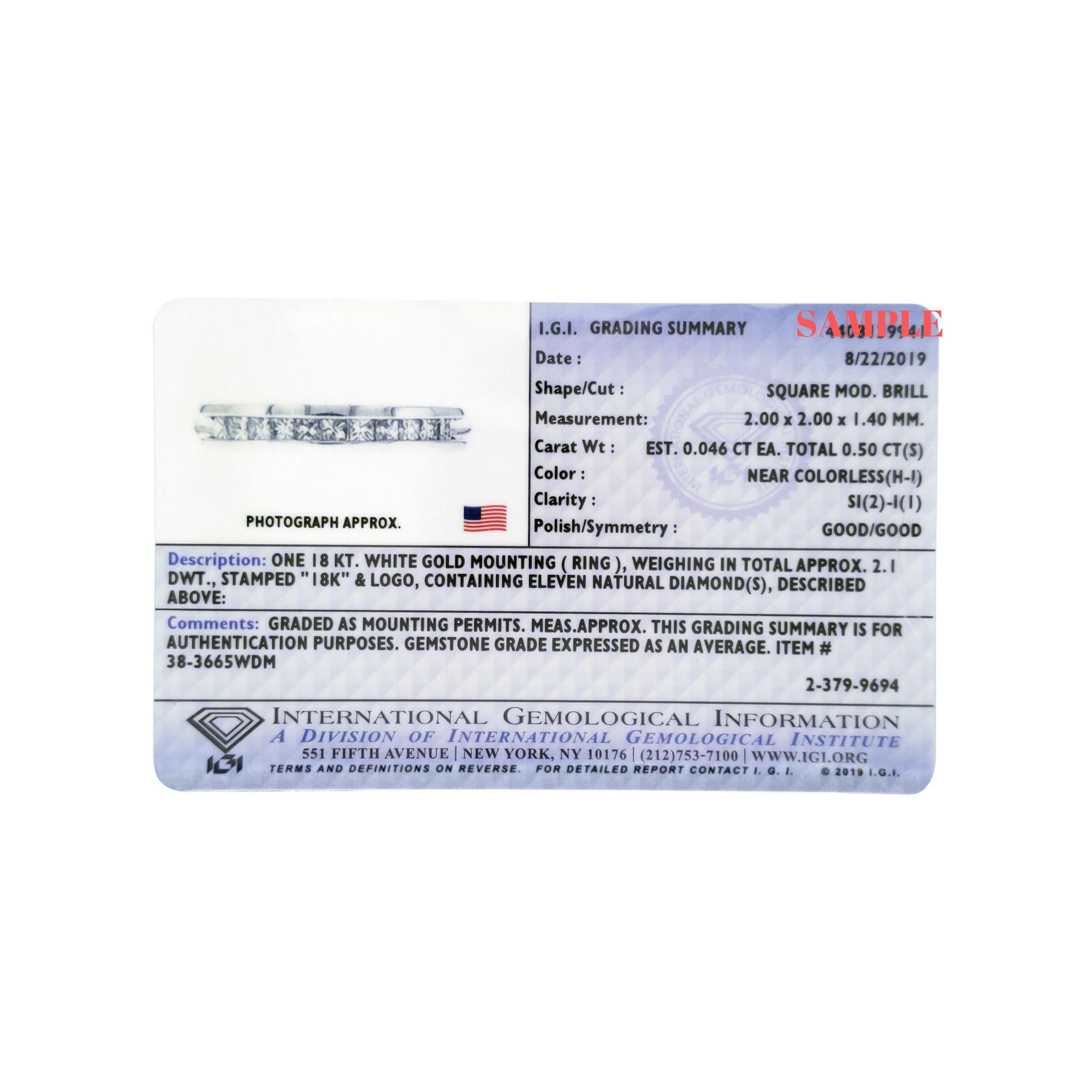 Elegant and timeless, this diamond wedding band features 1/2 carat total weight of diamonds with an astonishing eleven individual stones. This exquisite IGI certified 18 karat white gold wedding ring has eleven beautiful square, princess cut white diamonds channel set side by side into the face of this half-eternity style band. This classic yet bold modern band style ring makes a great gift for any special occasion and can serve as a promise ring, engagement ring, or anniversary band as well. Whether worn for daytime glamour or evening sparkle, this straight band is gorgeously versatile. It’s a timeless treasure she’ll enjoy wearing every day.